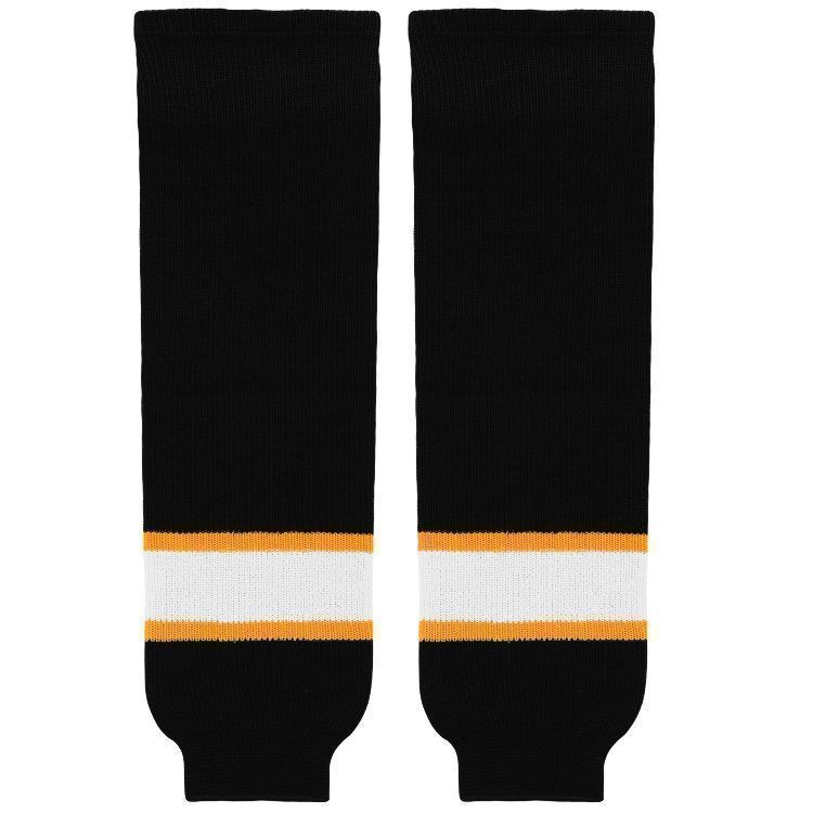 Boston Bruins hockey socks in home, away and 3rd styles. Boston Bruins knit hockey socks in stock in adult, intermediate and youth sizes in authentic Bruins gold and black striped patterns. AK knit hockey socks feature a 60% cotton / 40% polyester blended fabric and are pre washed and ready to wear. Made in Canada.