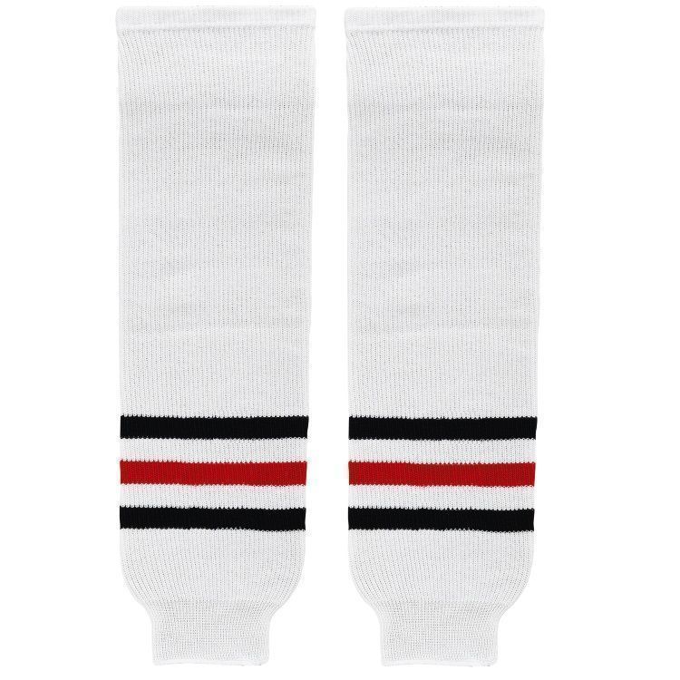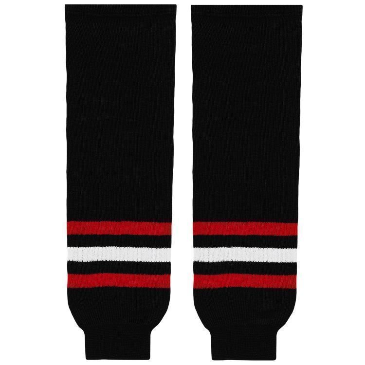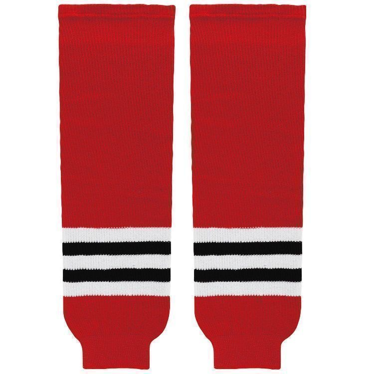 Chicago Blackhawks hockey socks in home, away and 3rd styles. Chicago Blackhawks knit hockey socks in stock in adult, intermediate and youth sizes in authentic Blackhawks red, black and white striped patterns. AK knit hockey socks feature a 60% cotton / 40% polyester blended fabric and are pre washed and ready to wear. Made in Canada.