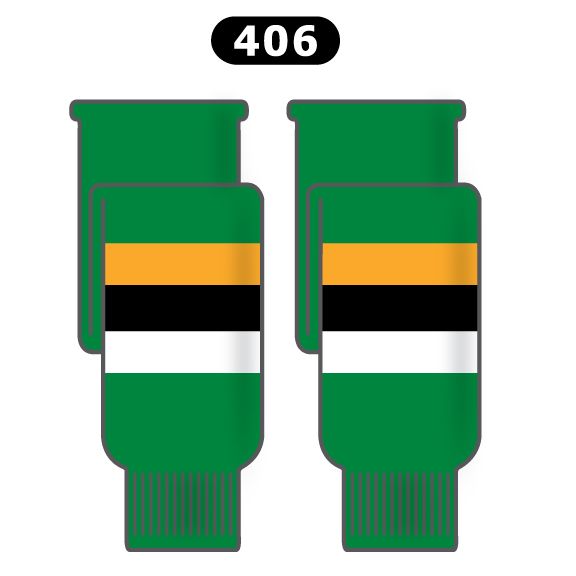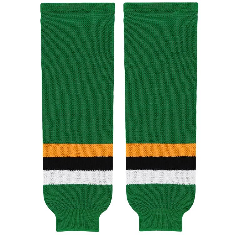 Minnesota North Stars hockey socks in home green pattern. Minnesota North Stars knit hockey socks in stock in adult, intermediate and youth sizes in authentic Stars kelly green, white and gold striped pattern. AK knit hockey socks feature a 60% cotton / 40% polyester blended fabric and are pre washed and ready to wear. Made in Canada.