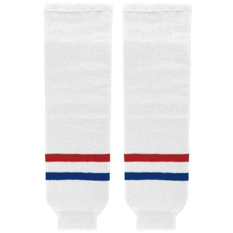 Montreal Canadiens hockey socks in home and away styles. Montreal Canadiens knit hockey socks in stock in adult, intermediate and youth sizes in authentic Habs red and white striped pattern. AK knit hockey socks feature a 60% cotton / 40% polyester blended fabric and are pre washed and ready to wear. Made in Canada.
