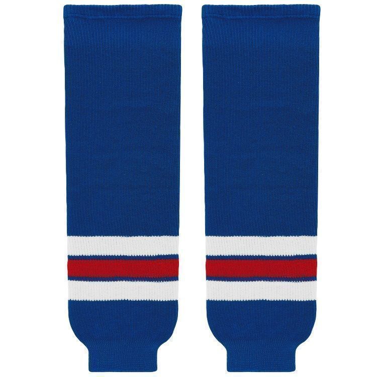 NY Rangers hockey socks in home and away. NY Rangers knit hockey socks in stock in adult, intermediate and youth sizes in authentic Rangers royal, red and white striped patterns. AK knit hockey socks feature a 60% cotton / 40% polyester blended fabric and are pre washed and ready to wear. Made in Canada.