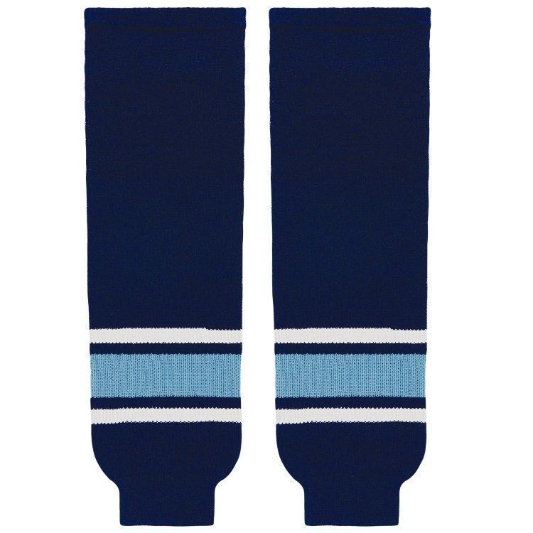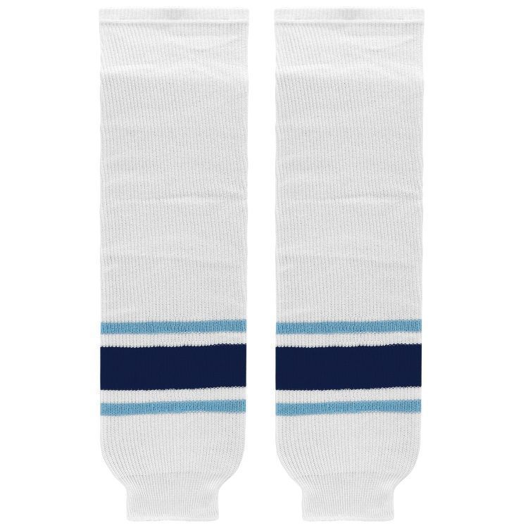 Maine hockey socks in home, away and 3rd powder blue. Maine knit hockey socks in stock in adult, intermediate and youth sizes in authentic Maine Bears powder, navy and white striped pattern. AK knit hockey socks feature a 60% cotton / 40% polyester blended fabric and are pre washed and ready to wear. Made in Canada.