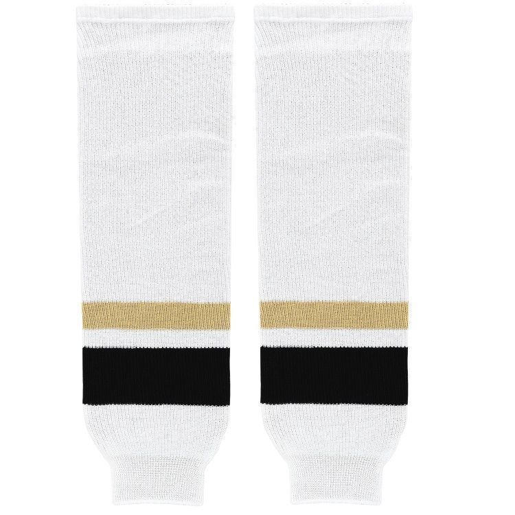 Pittsburgh Penguins hockey socks in black with classic vegas gold and white stripes. Pittsburgh Penguins H630-514 knit hockey socks in stock in adult, intermediate and youth sizes in authentic Penguins retro pattern. AK knit hockey socks feature a 60% cotton / 40% polyester blended fabric and are pre washed and ready to wear. Made in Canada.