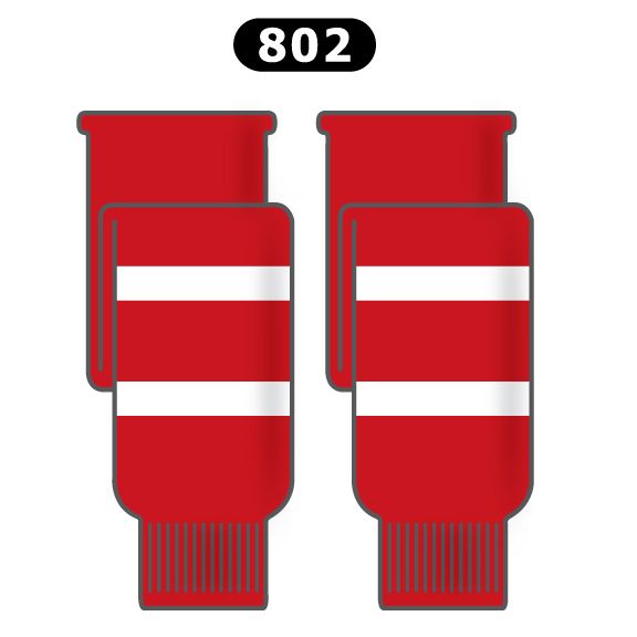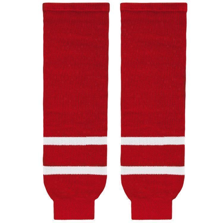 Carolina Hurricanes hockey socks in home red patterns. Carolina Hurricanes knit hockey socks in stock in adult, intermediate and youth sizes in authentic Hurricanes red and white team stripes. AK knit hockey socks feature a 60% cotton / 40% polyester blended fabric and are pre washed and ready to wear. Made in Canada.