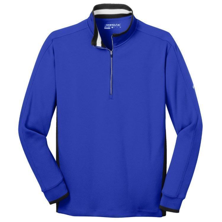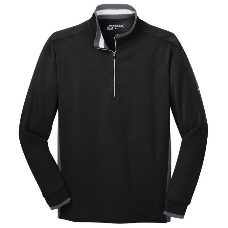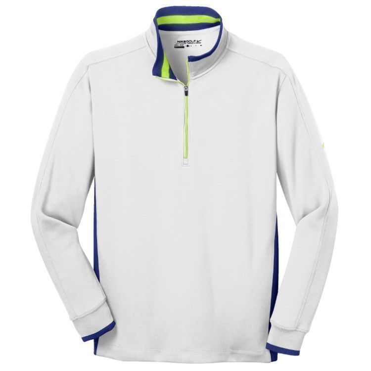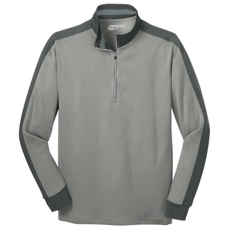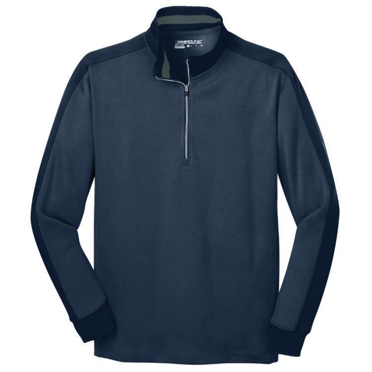 Nike Golf Dri-Fit 1/2 zip pullover in brushed 8.3 oz. polyester wicking fabric. Nike Golf 578673 pullovers have a half zip front, flat knit striped collar / cuffs, contrast tipped cuffs,open bottom hem, tag free heat seal label and embroidered Nike Swoosh logo on the left sleeve. Prices include custom logo embroidery.