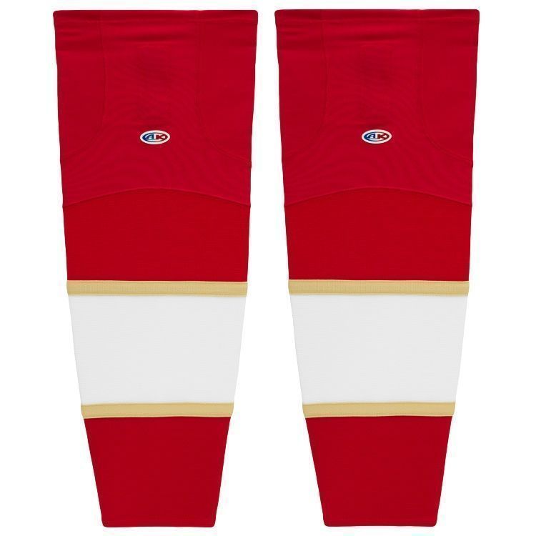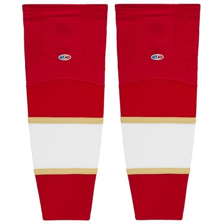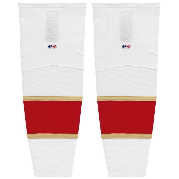 Florida Panthers air knit hockey socks in new home and away styles. Florida Panthers air-knit hockey socks in stock in adult, intermediate and youth sizes in authentic 2017-18 Florida red and white sewn striping. Athletic Knit HS2100 air-knit hockey socks feature pro weight edge style air knit fabric with Dry-Flex wicking stretch panels and two sewn Velcro tabs.
