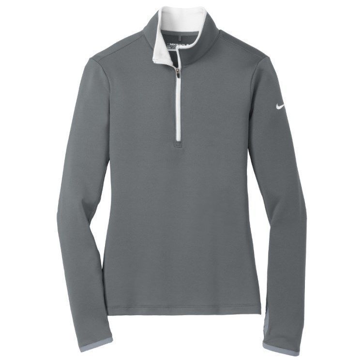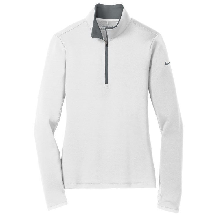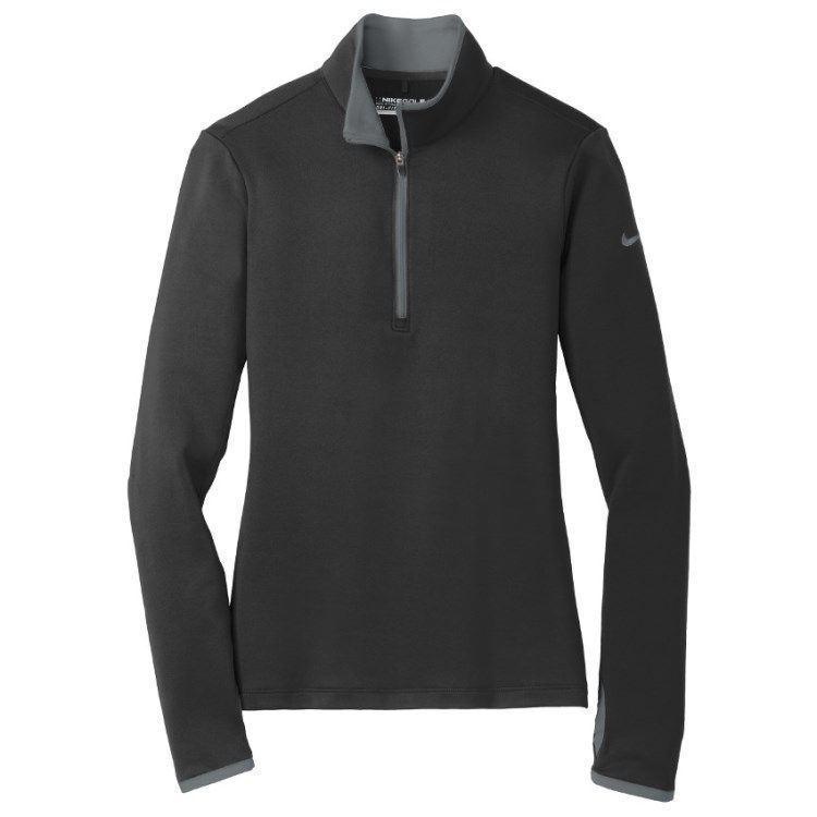 Nike Golf Dri-Fit 1/2 zip womens pullover in 7.6 oz. polyester spandex stretch wicking fabric. Nike Golf 779796 pullovers have a half zip front, contrast collar and zipper, open cuffs with thumb-holes, open hem, tag free heat seal label and embroidered Nike Swoosh logo on the left sleeve. Prices include custom logo embroidery.