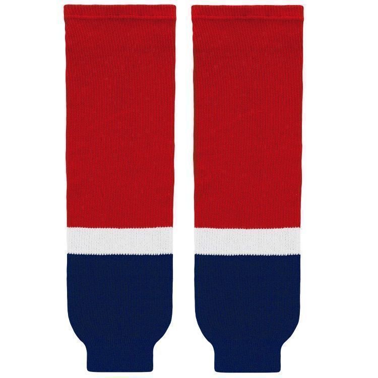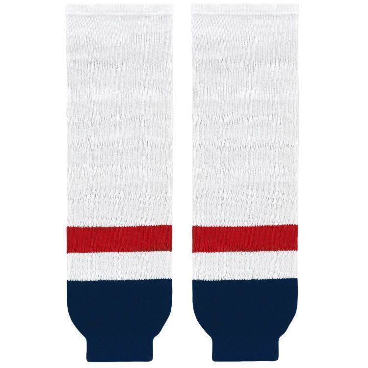 Washington Capitals hockey socks in home and away styles. Washington Capitals knit hockey socks in stock in adult, intermediate and youth sizes in authentic Capitals blue, red and white striped pattern. AK knit hockey socks feature a 60% cotton / 40% polyester blended fabric and are pre washed and ready to wear. Made in Canada.