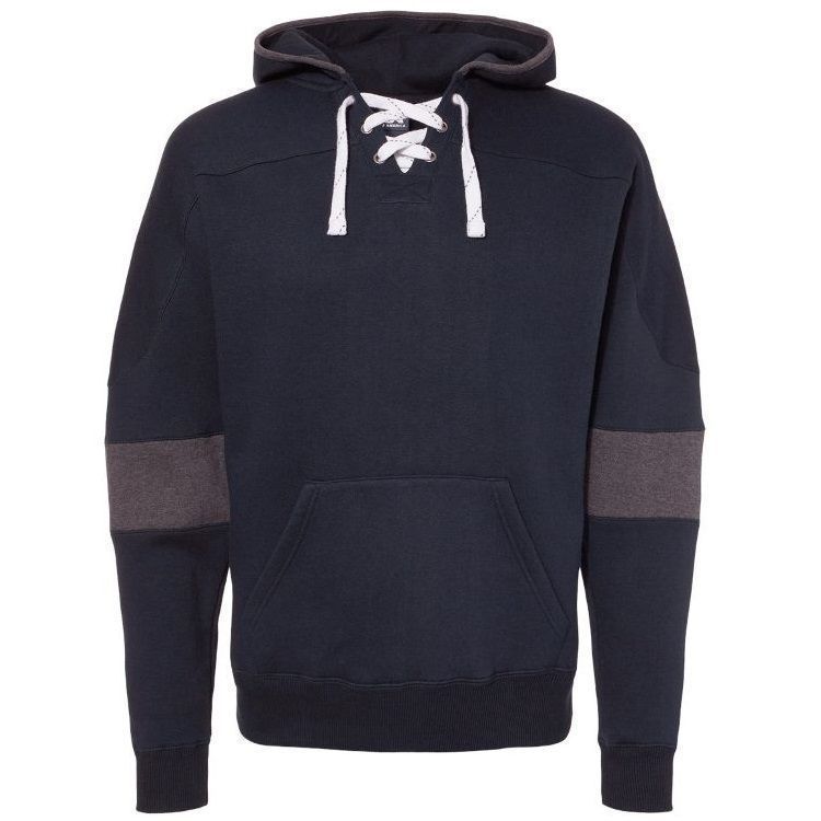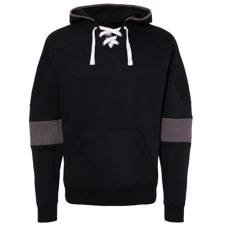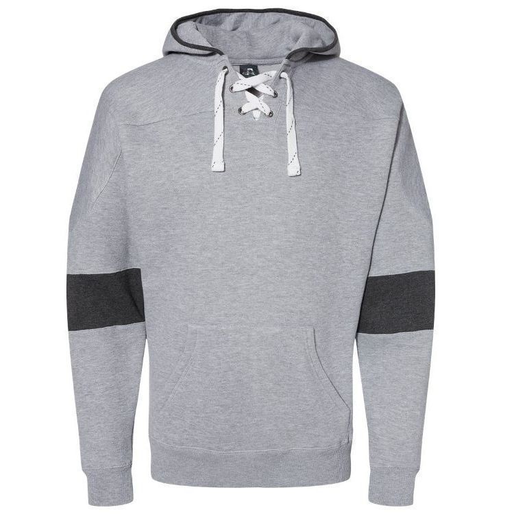 JA8832 striped sleeve hockey hoodie features heavyweight 10 oz. poly cotton ring-spun fabric with a jersey lined hood with trim and 6 metal eyelets skate lace tie design. JA8832 lace up hockey hoodie features contrast charcoal striped sleeves, set-in pouch pocket, with 2 inch rib knit cuffs and waist design.