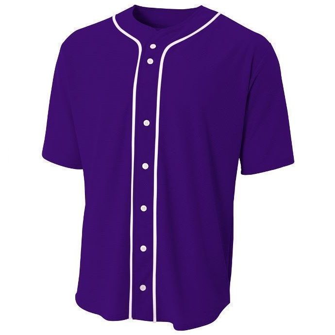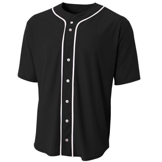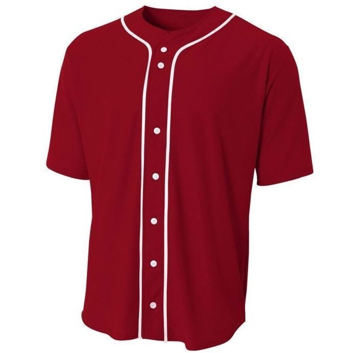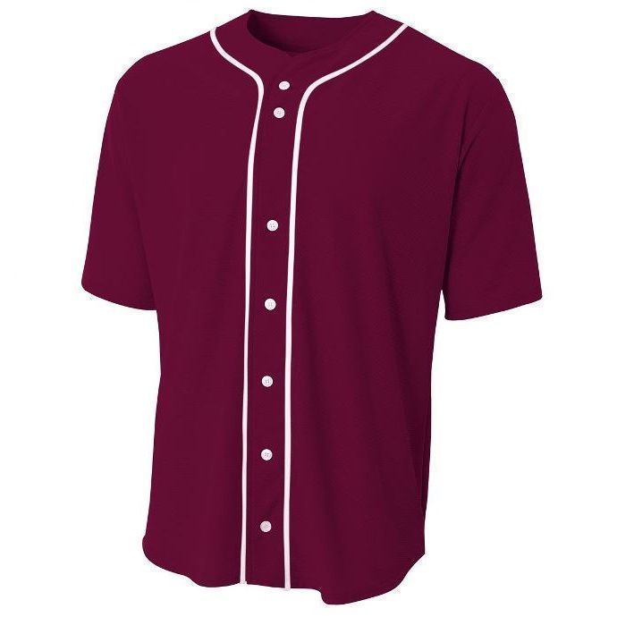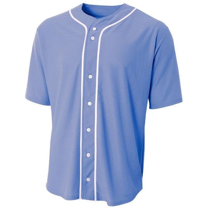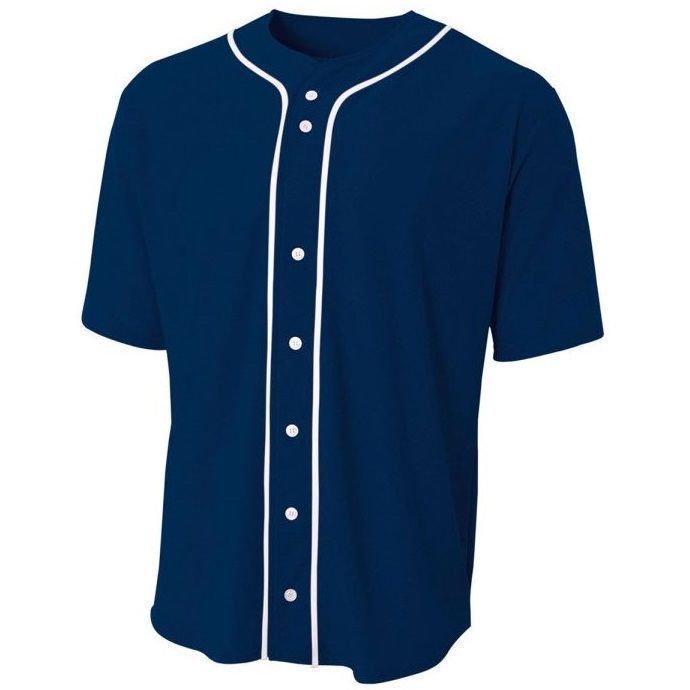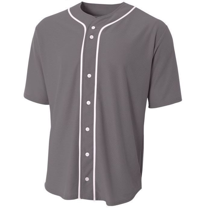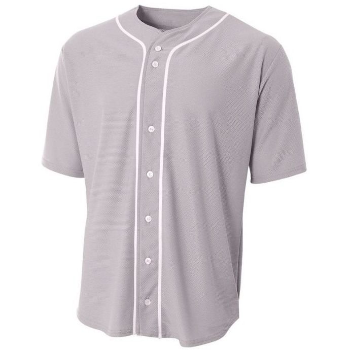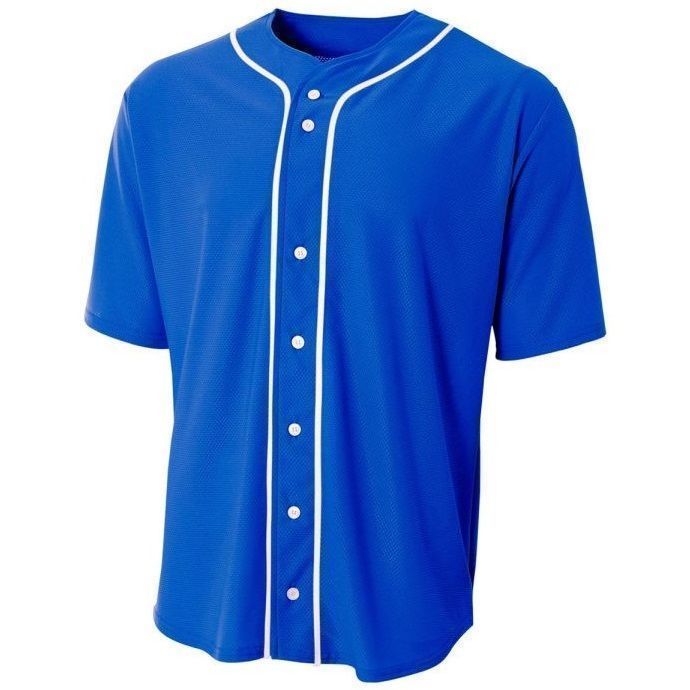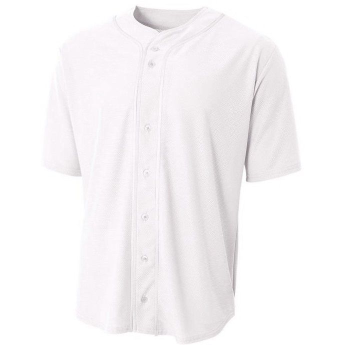 A4 N4184 full button baseball jersey is made of mid weight 6oz. 90% poly / 10% spandex pin-point wicking stretch fabric and classic white contrast piping on neck / center placket. A4 N4184 baseball jersey has a full button front, stain release / low odor antimicrobial finish, set-in sleeves and double stitched rounded bottom hem. Youth through adult 3XL sizes.