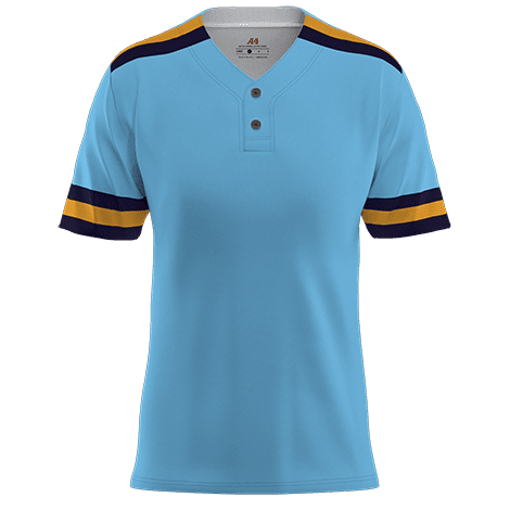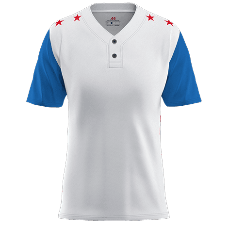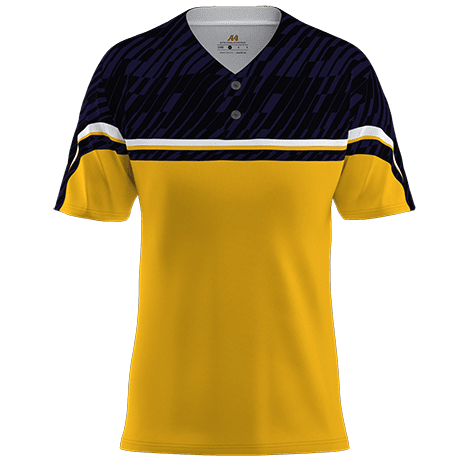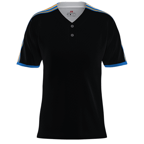 A4 softball jersey colors, logos, player name & numbers are dye sublimated directly into the light weight DuraTek wicking 5-star fabric. Sublimation dyes are permanently bonded to the molecules of the fabric for maximum ruggedness and durability. Two button jerseys feature a longer length, set-in sleeves and straight bottom hem.