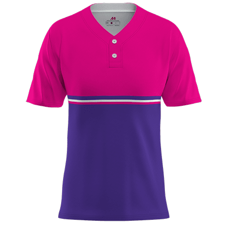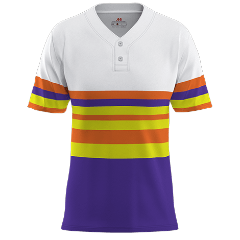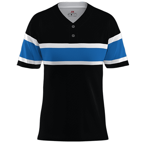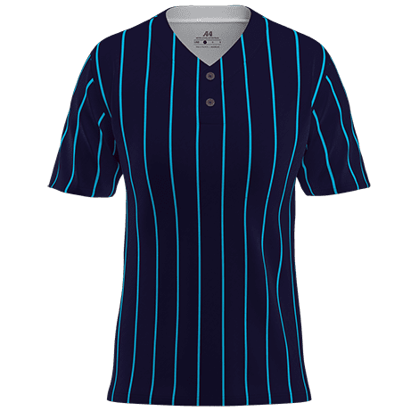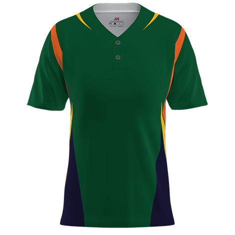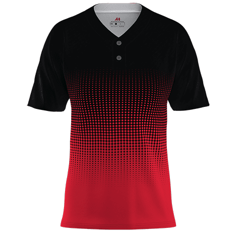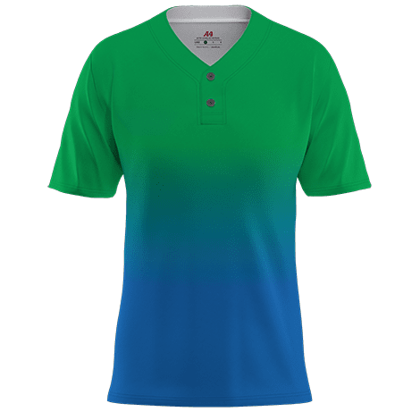 Sublimated 2-button softball jerseys by A4. A4 AE124W two button sublimated softball jerseys in DuraTek polyester wicking fabric with pullover 2 button placket.