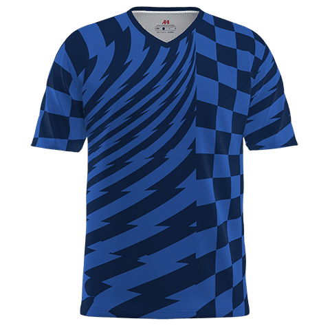 Sublimated v-neck soccer jerseys by A4. A4 AS102M v-neck sublimated soccer jerseys in DuraTek polyester wicking fabric with pullover v-neck design.