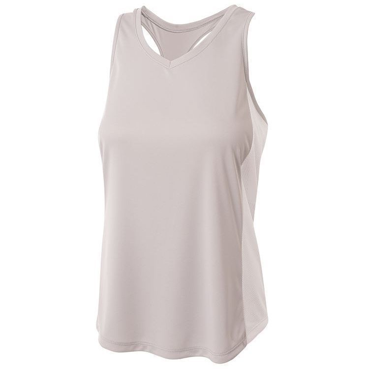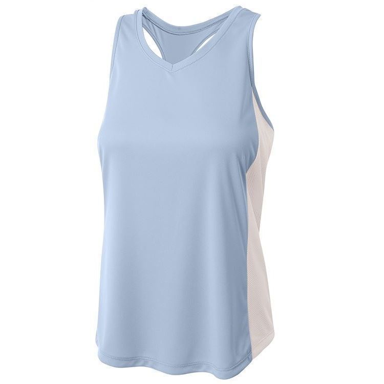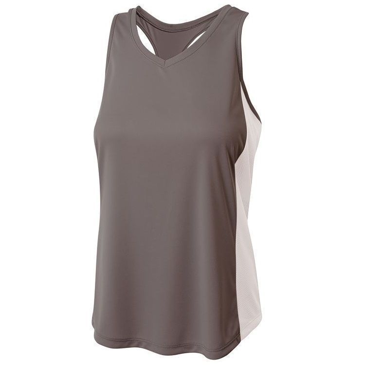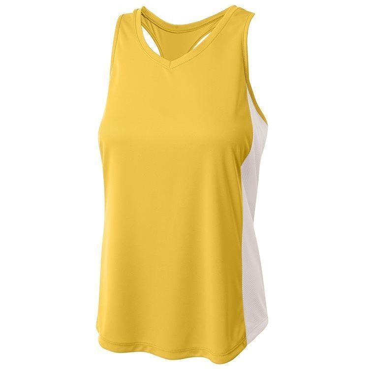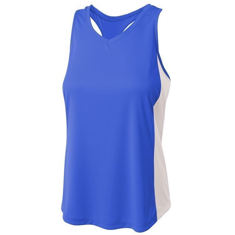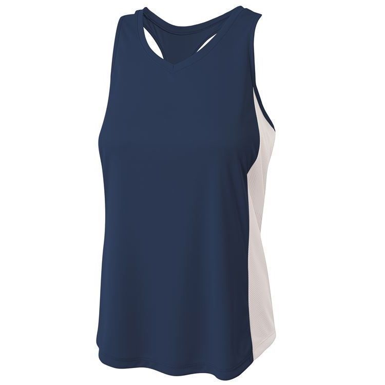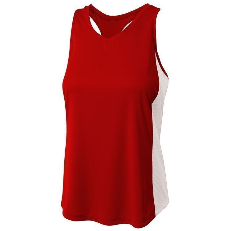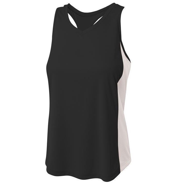 A4 NW2009 womens pacer track singlet features 100% polyester interlock wicking stain release fabric with mesh side inserts for breathability. A4 NW2009 ladies track tank also features contrasting side stripe / racerback design, antimicrobial finish for low odor, self binding neck & armholes, heat seal neck and reinforced stitching at hems and shoulders.
