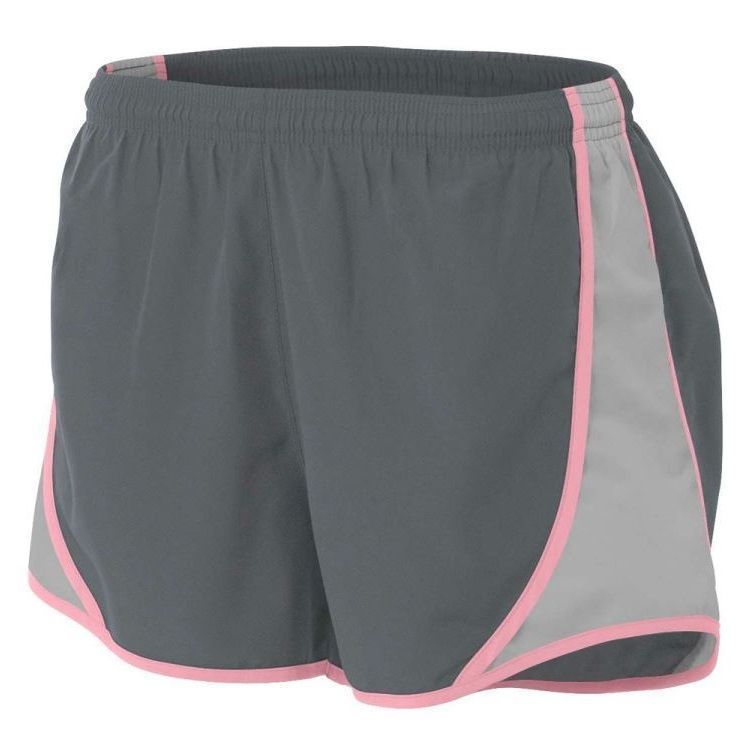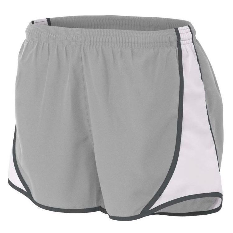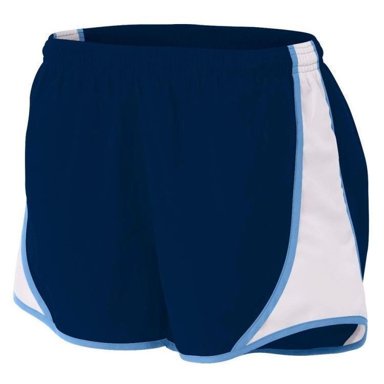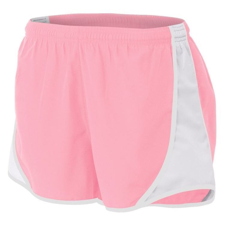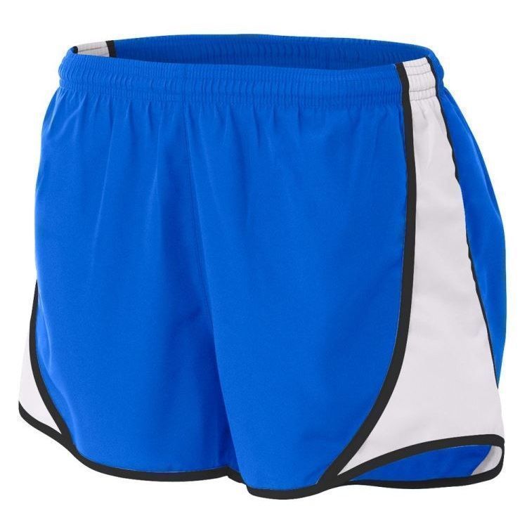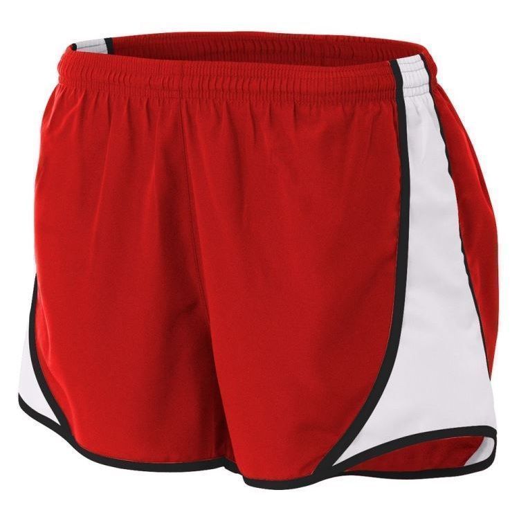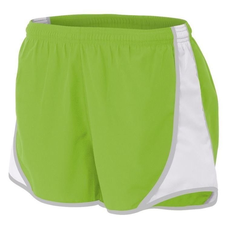 A4 NW5341 womens Speed track shorts feature 100% polyester wovn fabric with side insert, contrast stripes, moisture wicking liner, coin pocket, a covered elastic waistband, and self fabric binding hem.