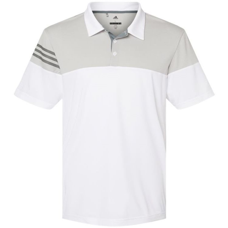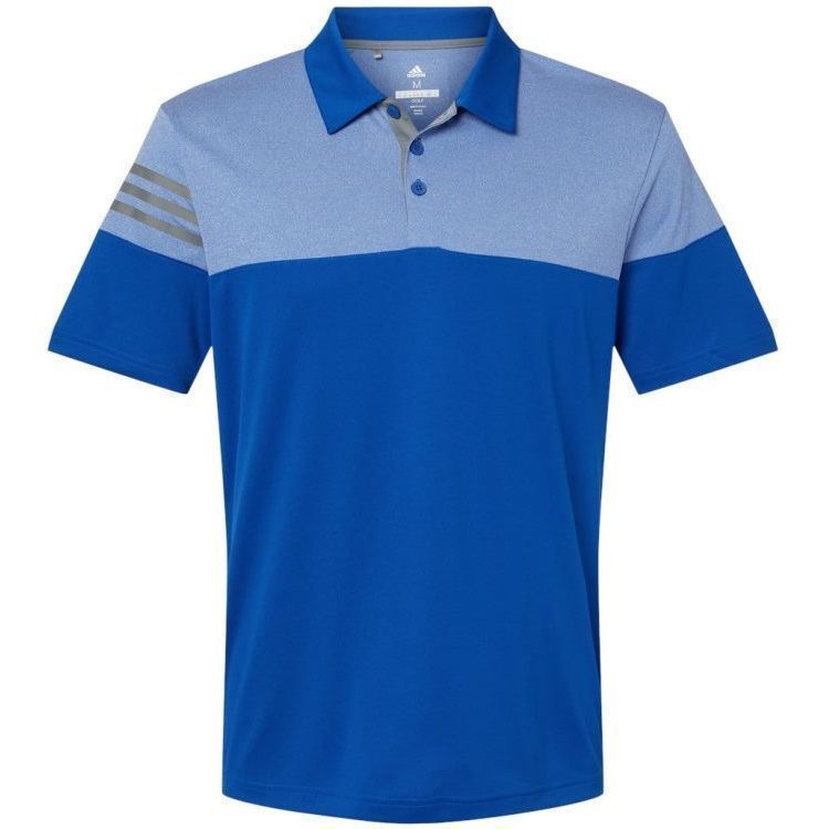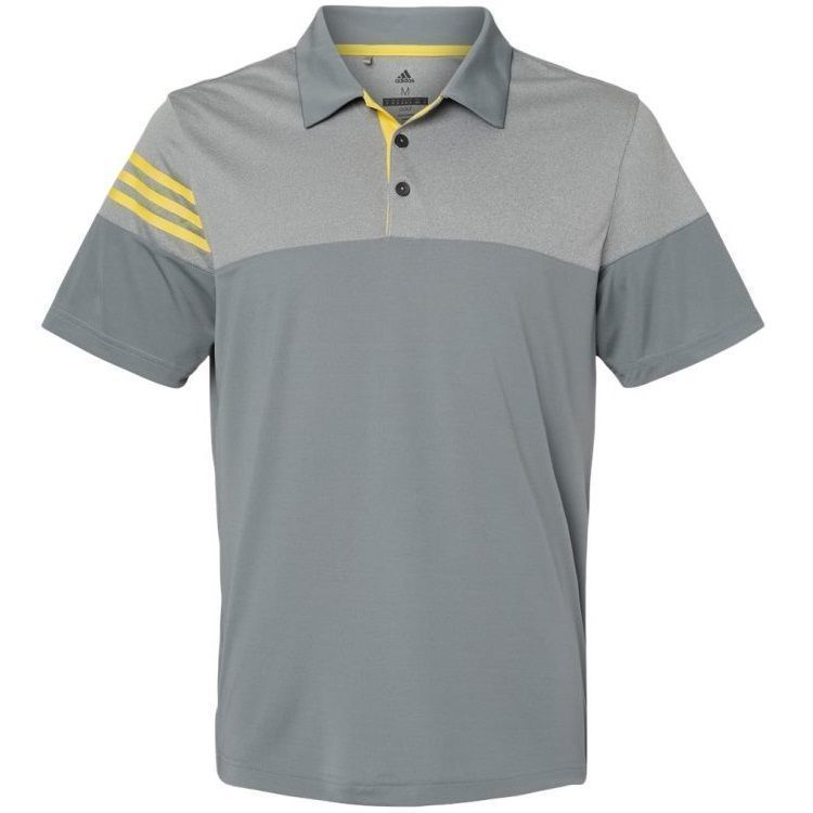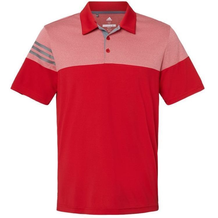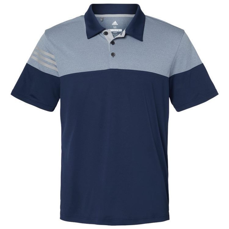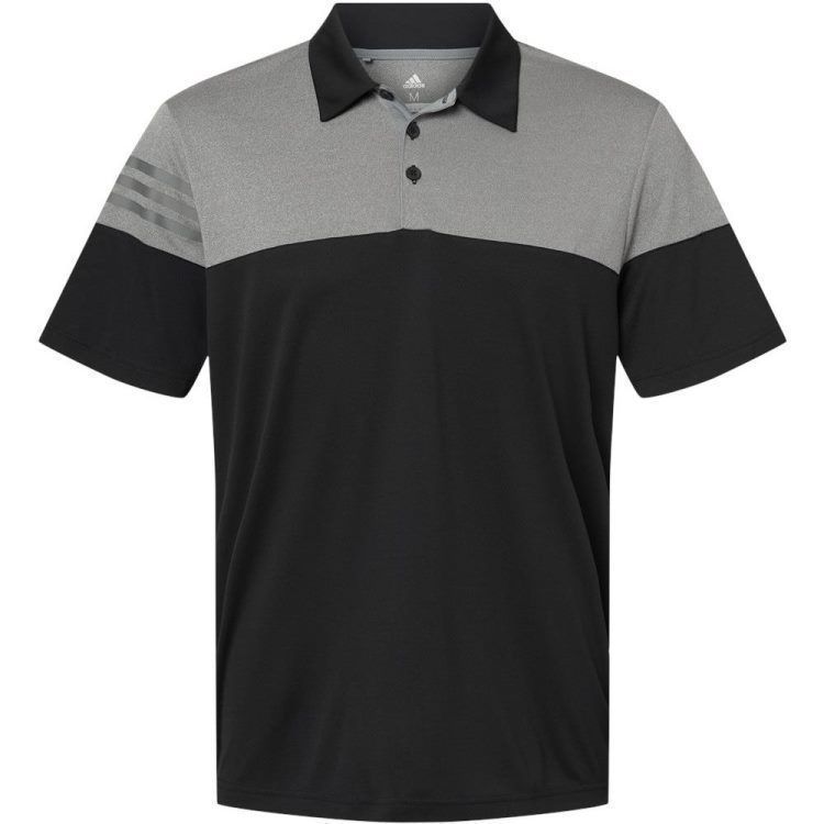 Adidas Golf men's heathered 3 stripe polo in 3.8 oz. recycled polyester wicking fabric with heather colorblock upper chest, back and shoulders. Adidas Golf A213 polo has a self fabric collar, a 3 button placket, 3-stripe print on right sleeve, UPF 30+ protection, open hem sleeves and Adidas Golf logo on the upper back. Prices include custom logo embroidery.