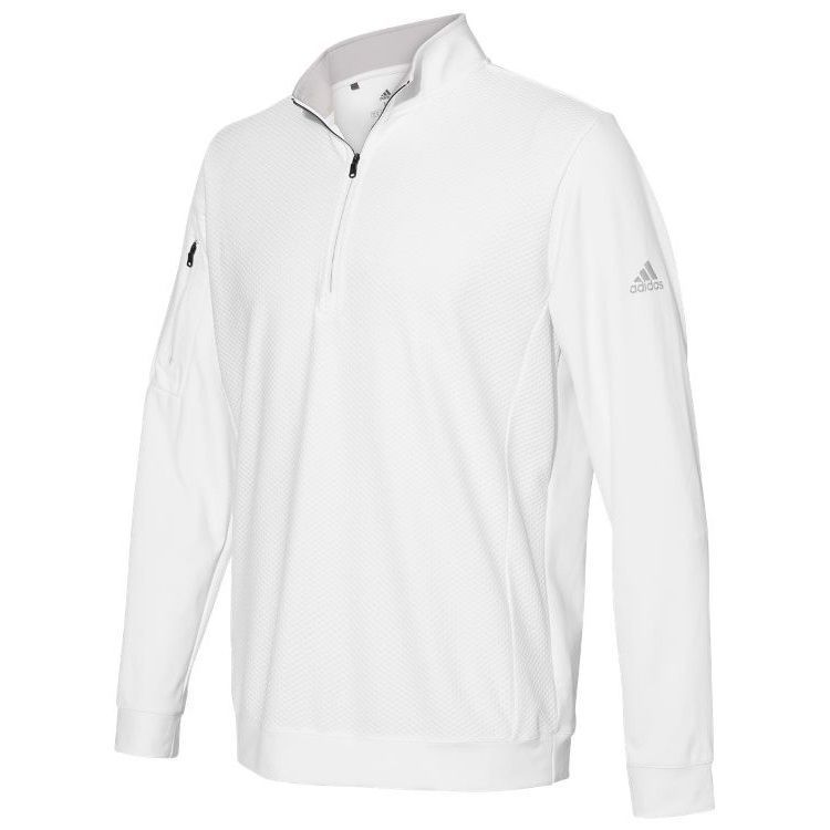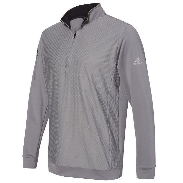 Adidas Golf textured 1/2 zip pullover in 8.1 oz. poly/spandex interlock fabric with water resistant hydrophilic finish. Adidas Golf A295 mens pullovers have a textured body with solid sleeves, quarter zip front, self mock collar, bottom hem and cuffs, left zippered pocket, UPF 50+, tag free heat seal label and Adidas Golf logo on the left sleeve. Prices include custom logo embroidery.