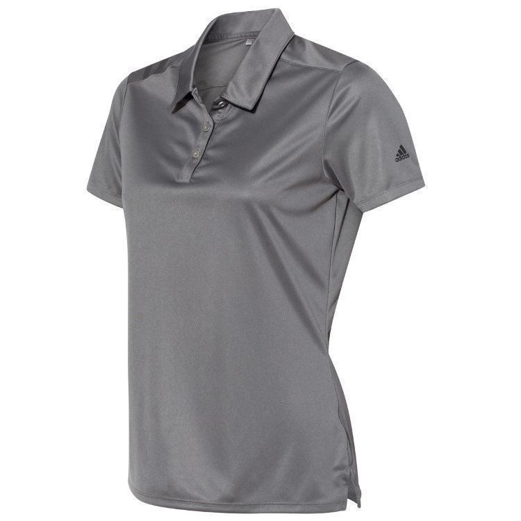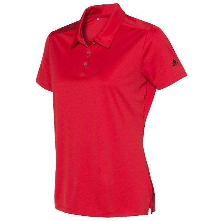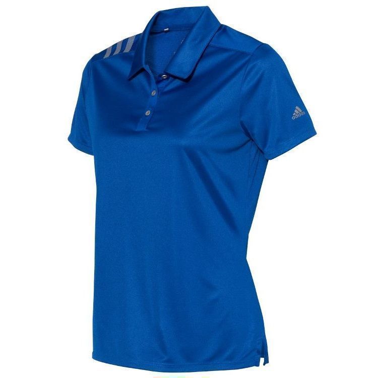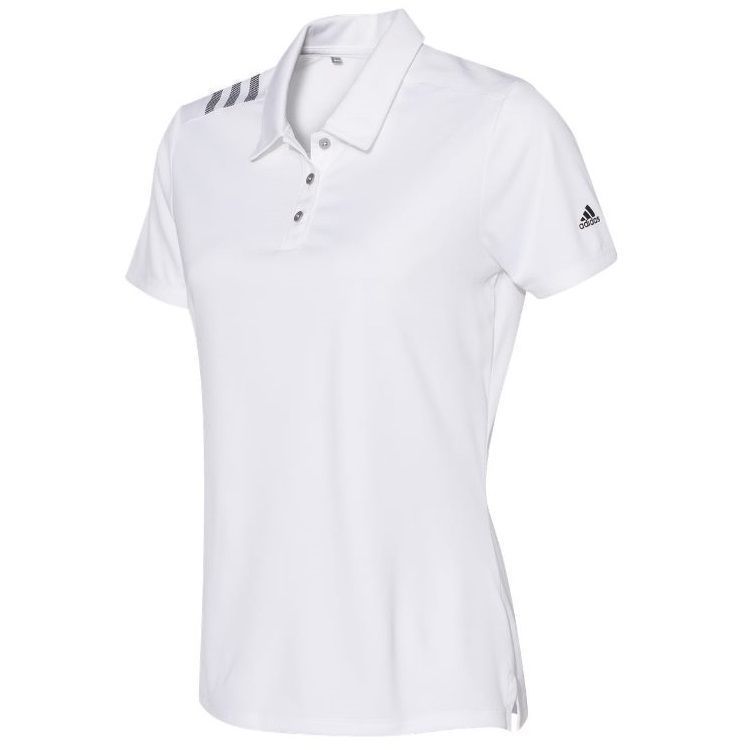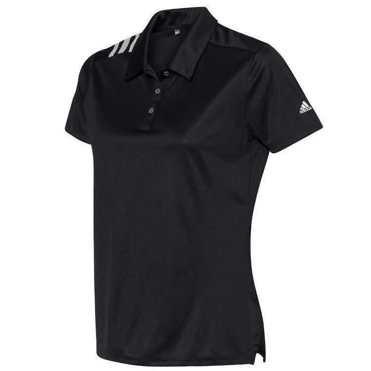 Adidas Golf women's 3 stripe polo in 5.3 oz. recycled polyester fabric with water resistant hydrophilic finish. Adidas Golf A325 ladies polo has a self fabric collar, a 3 button placket, 3-stripe print on right shoulder, UPF 50+ protection, open hem sleeves and Adidas Golf logo on the left sleeve. Prices include custom logo embroidery.