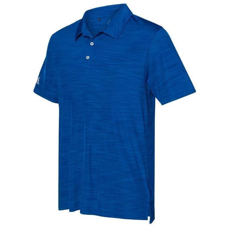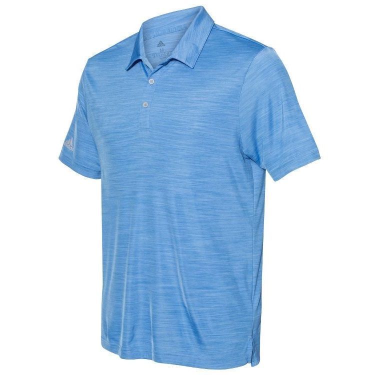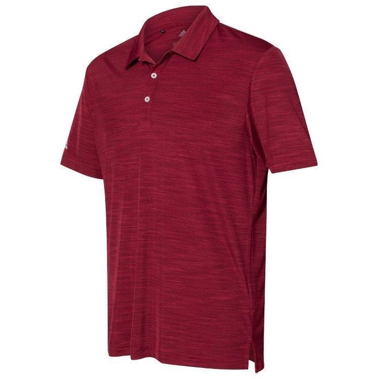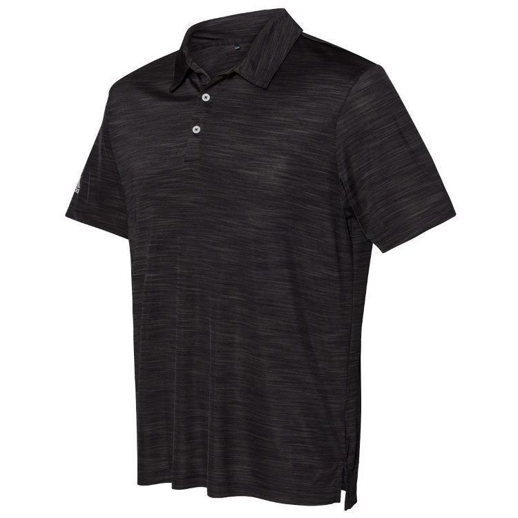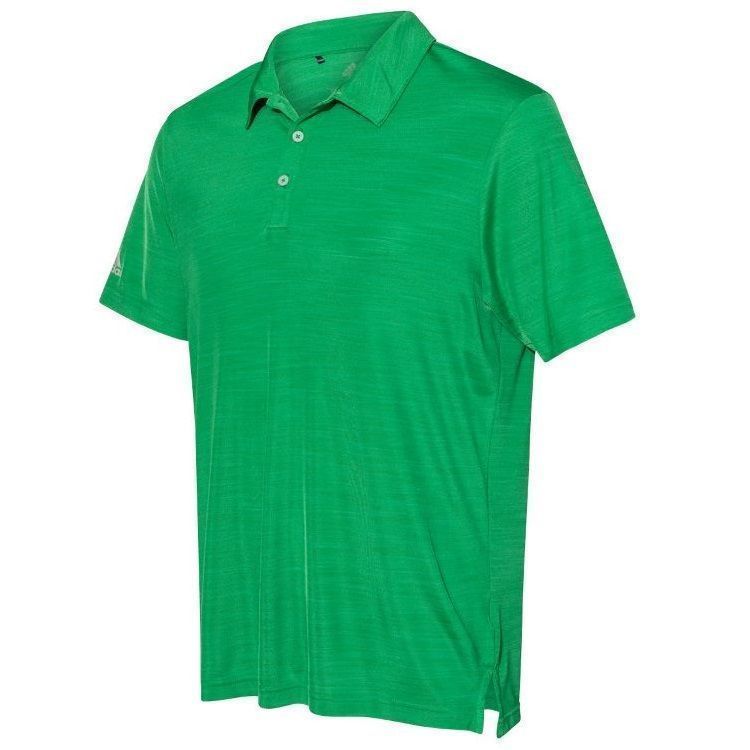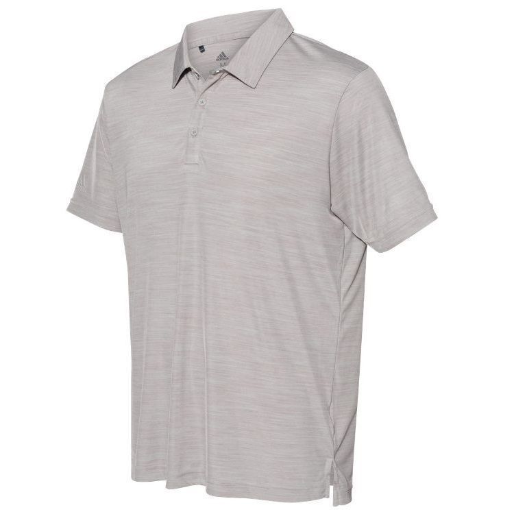 Adidas Golf men's heather interlock polo in 5.6 oz. recycled polyester wicking fabric with melange finish. Adidas Golf A402 polo has a self fabric collar, a 3 button placket, dye matched buttons, open hem sleeves and Adidas Golf logo on the right sleeve. Prices include custom logo embroidery.