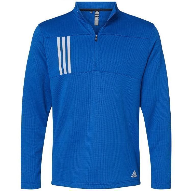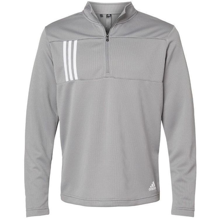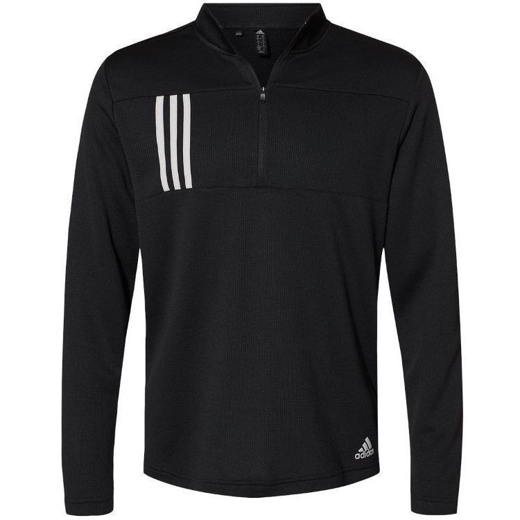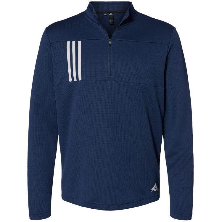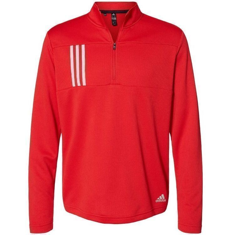 Adidas Golf 3-Stripe 1/4 zip pullover in 7.2 oz. recycled wicking polyester with waffle knit construction. Adidas Golf A482 mens pullovers have a quarter zip front, 3 stripe chest insert, self mock collar, open bottom hem and cuffs and Adidas Golf logo on the left bottom hip. Prices include custom logo embroidery.