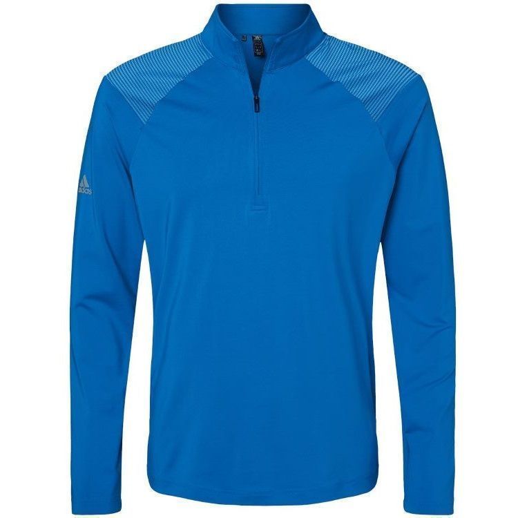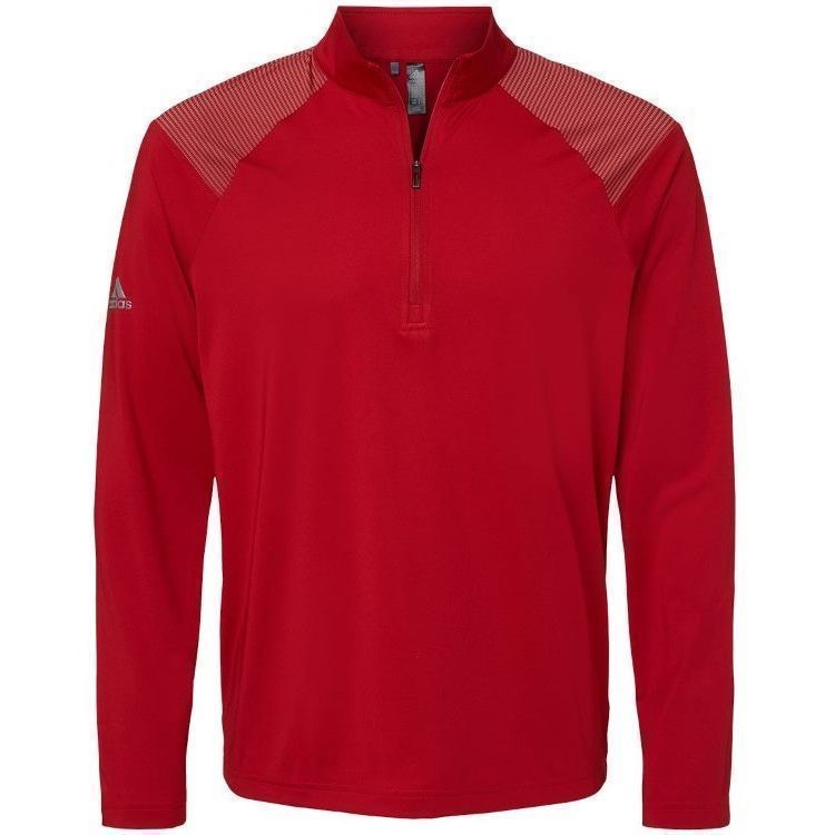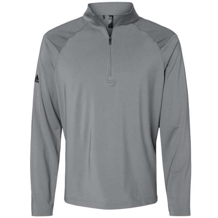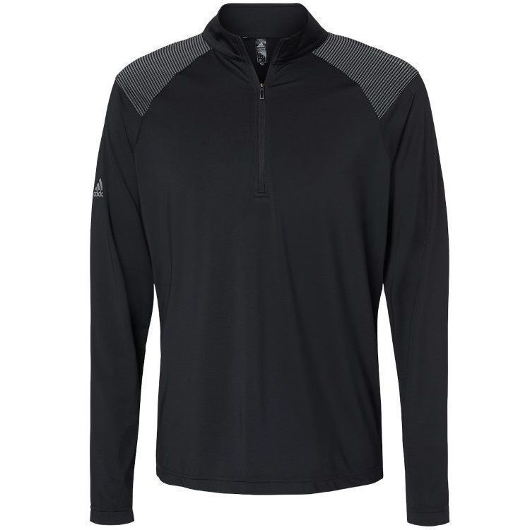 Adidas Golf midweight 1/4 zip pullover in 6 oz. polyester elastane wicking fabric with striped shoulder panels. Adidas Golf A520 mens pullovers have a quarter zip front, self mock collar, open bottom hem and cuffs, UPF 50+, tag free heat seal label and Adidas Golf logo on the right sleeve. Prices include custom logo embroidery.