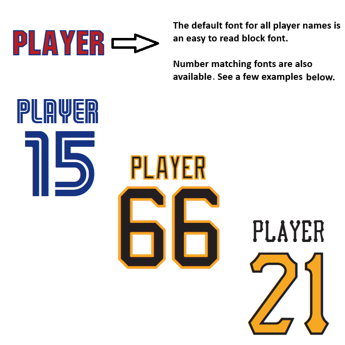 Athletic Knit DTF player names can be added to any AK hockey, baseball or basketball jersey order. Choose from 70 DTF colors designed to match AK jerseys. 1 or 2-color player names in several fonts.