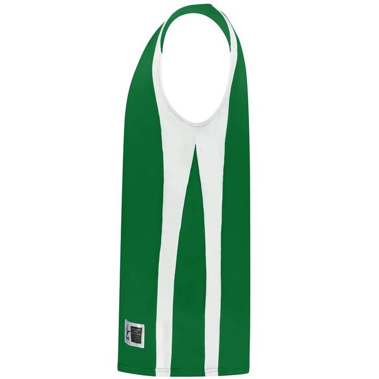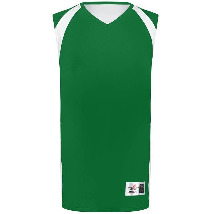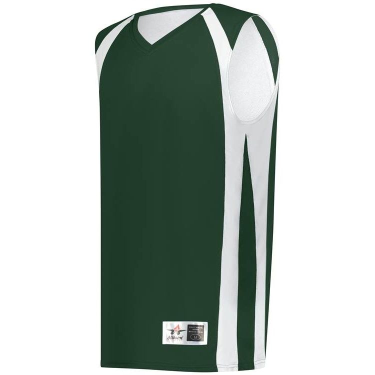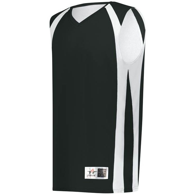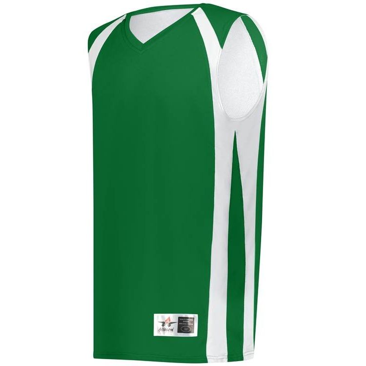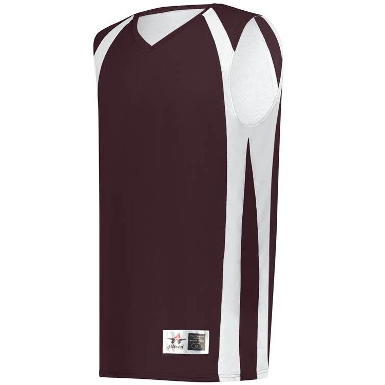 Alleson 54MMR wicking reversible basketball jersey features 100% polyester wicking mock mesh cationic colorfast polyester. Alleson 54MMR reversible basketball jersey also features contrast color side stripes, wide shoulder design, collegiate cut, Alleson jock tag and double needle hemmed bottom.