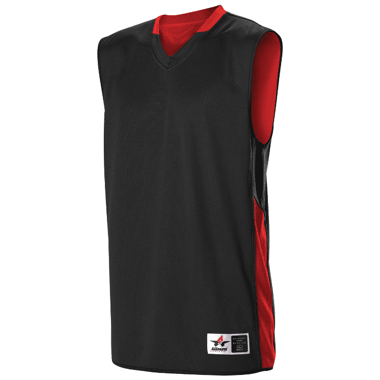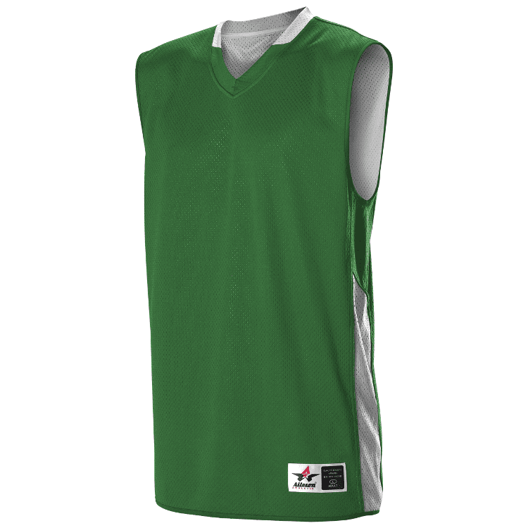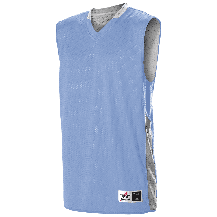 Alleson 589RSP wicking reversible basketball jersey features 100% extreme polyester wicking mock mesh cationic colorfast polyester with single ply design. Alleson 589RSP reversible basketball jersey also features contrast color side stripes, wide shoulder design, collegiate cut, Alleson jock tag and double needle hemmed bottom.