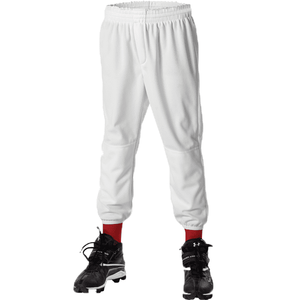 Alleson pull up baseball pants are made of 9.5oz. double knit fabric with a classic flyless pull on design. Alleson 604PDK2 baseball pants have a four needle waistband with inner drawcord, double reinforced knees, a single set-in welt back pocket and a relaxed fit. Available in youth to adult sizes.