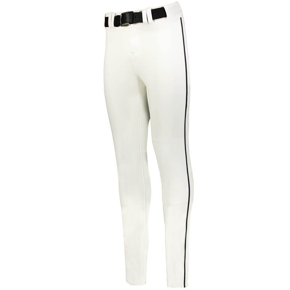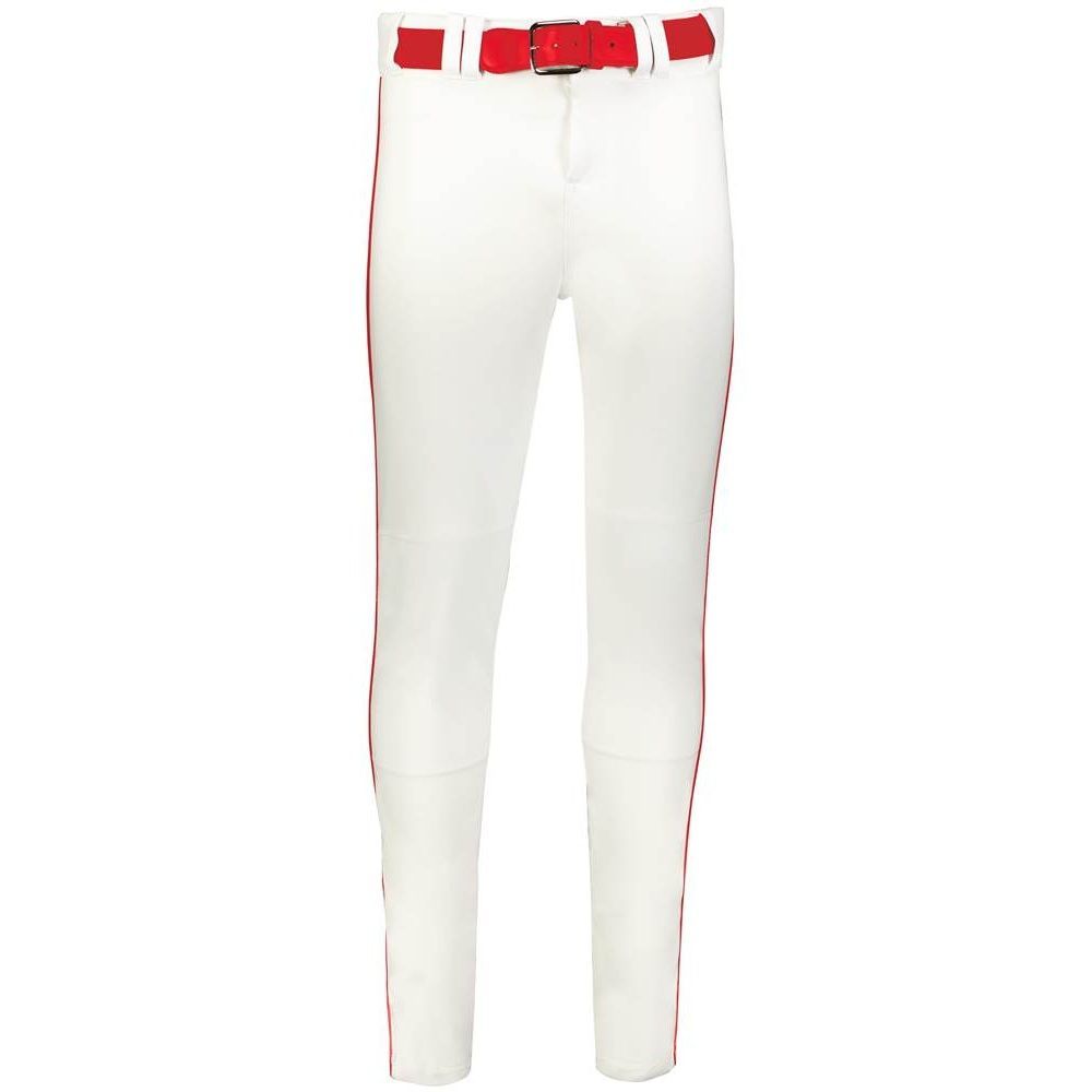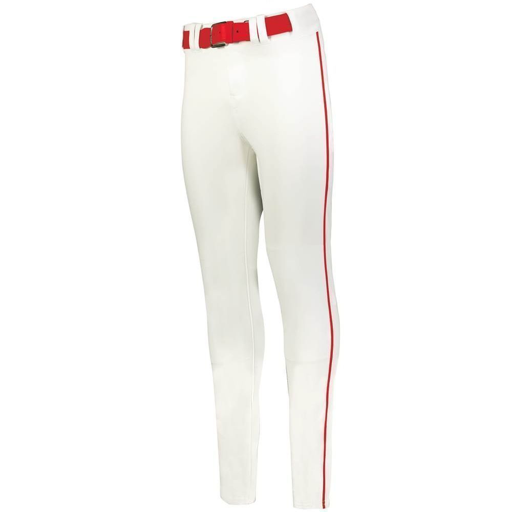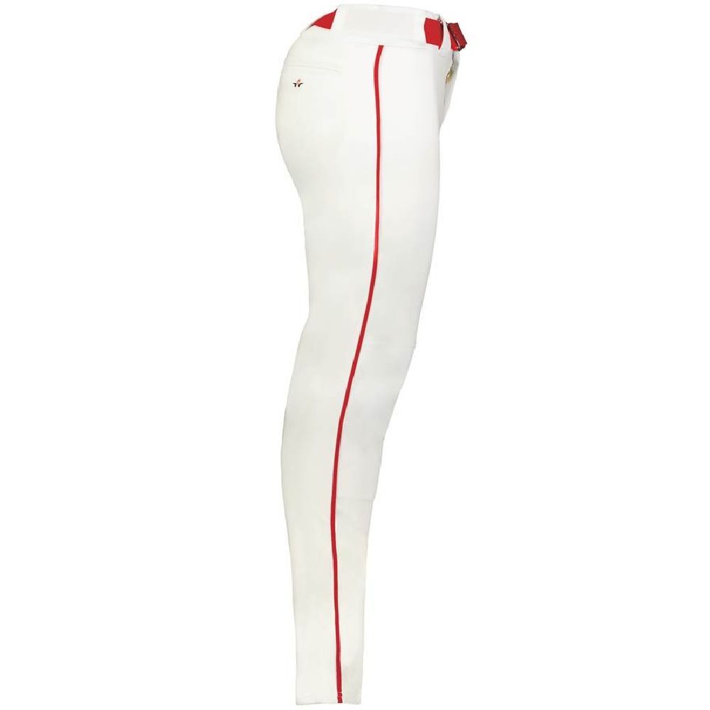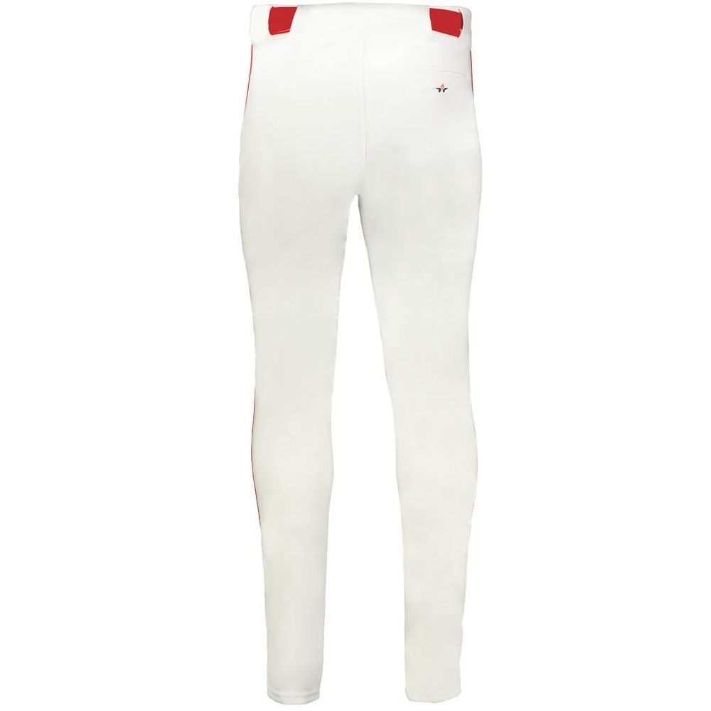 Alleson 657CTB tapered baseball pants with braid are made of 14oz. dura-stretch double knit fabric with tapered leg design. Alleson 657CTBY baseball pants have a heavyweight 2-1/2 inch gripper waistband, 5 pro tunnel belt loops, double reinforced knees, side seam piping, dual snap closure with zipper, two set-in welt back pockets and hemmed leg bottoms. Available in youth to adult sizes.