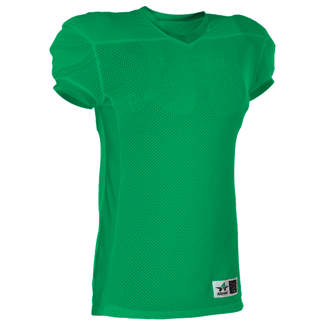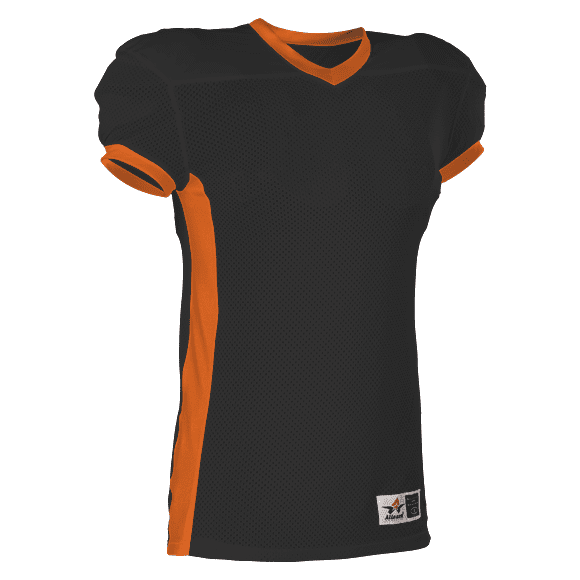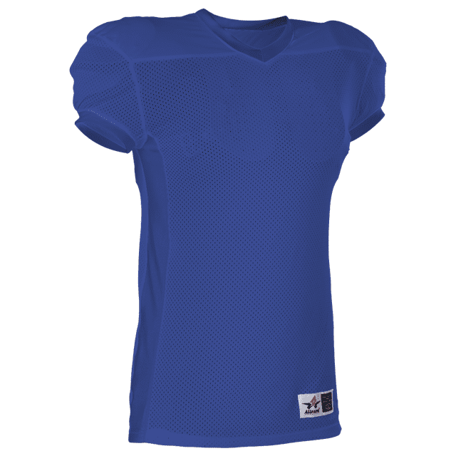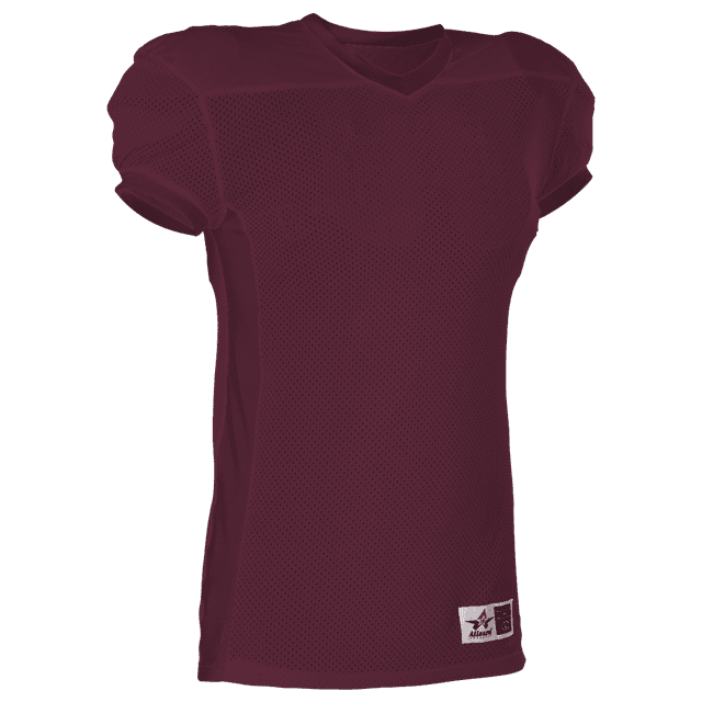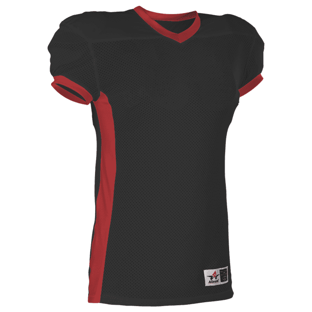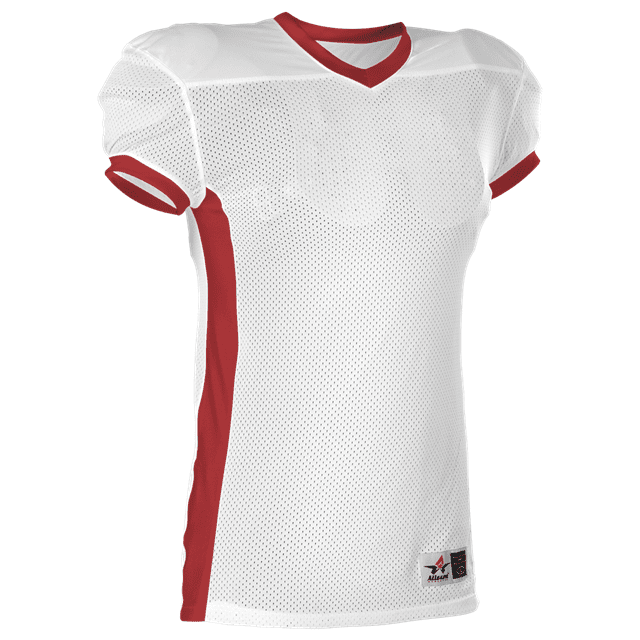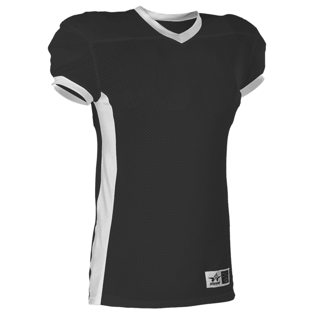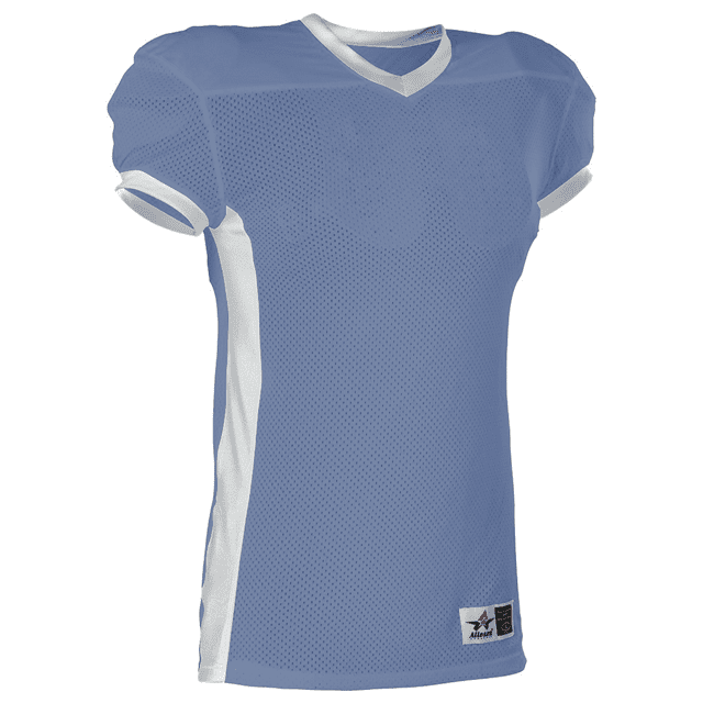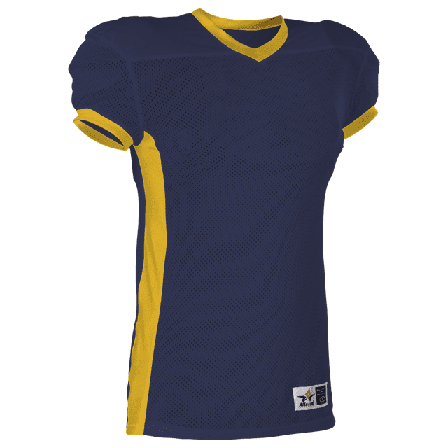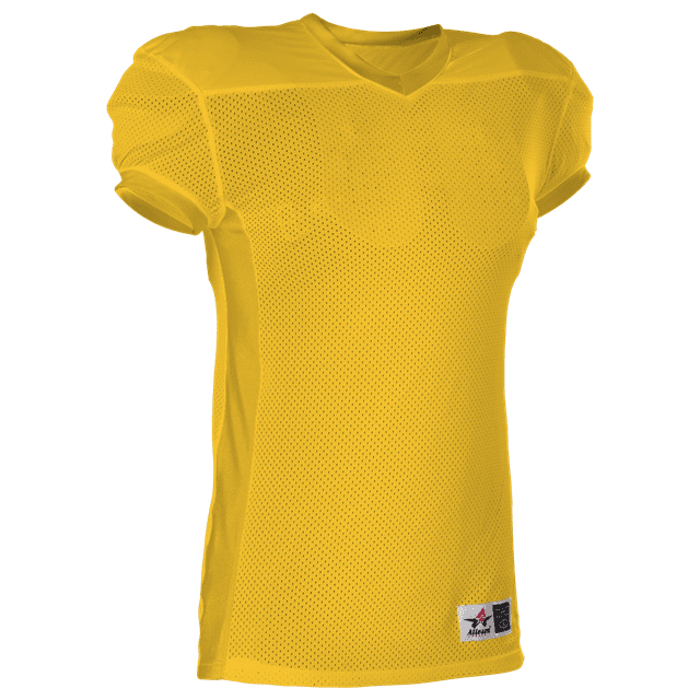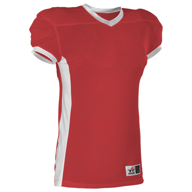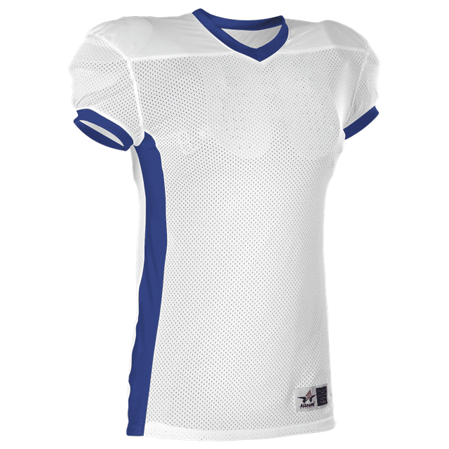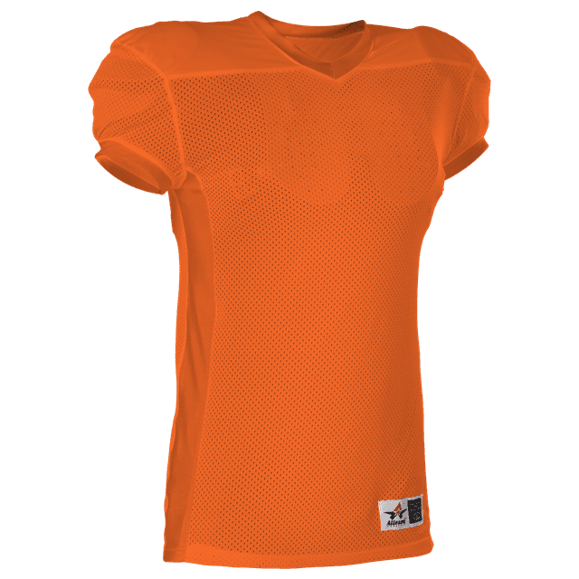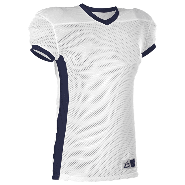 Alleson 750E football jersey features 100% extreme mesh cationic colorfast polyester tricot mesh body, double dazzle yoke / sleeves and spandex side inerts for a pro-style fit. Alleson 750E jersey also features a classic v-neck cut and a full length body cut.