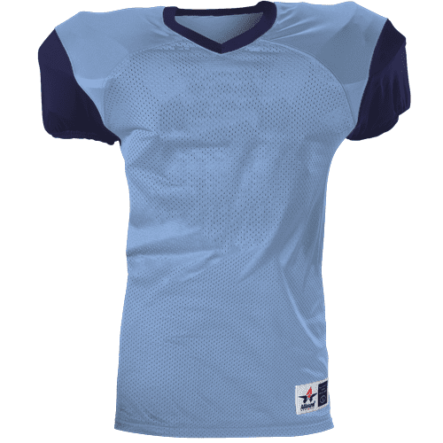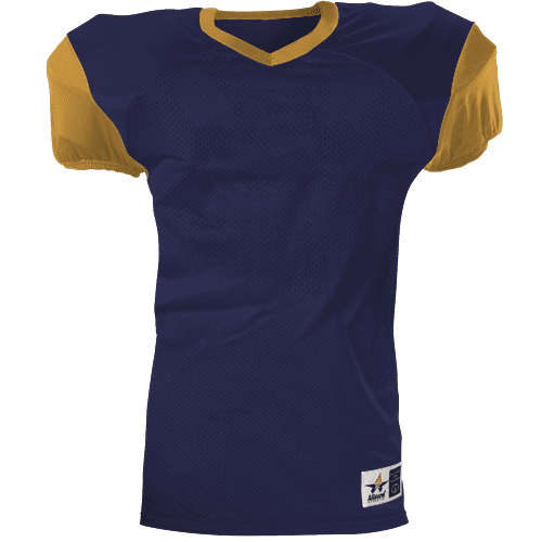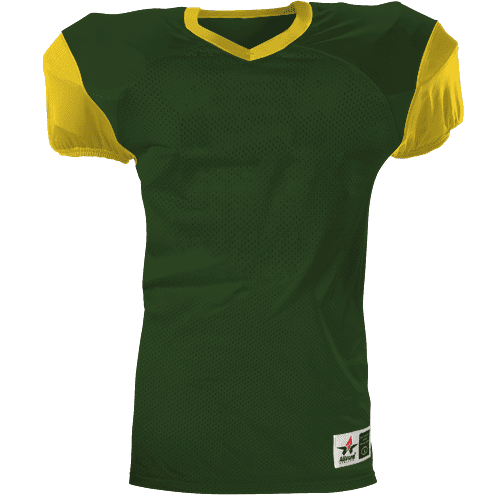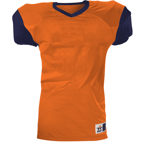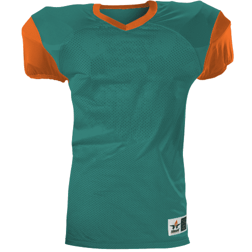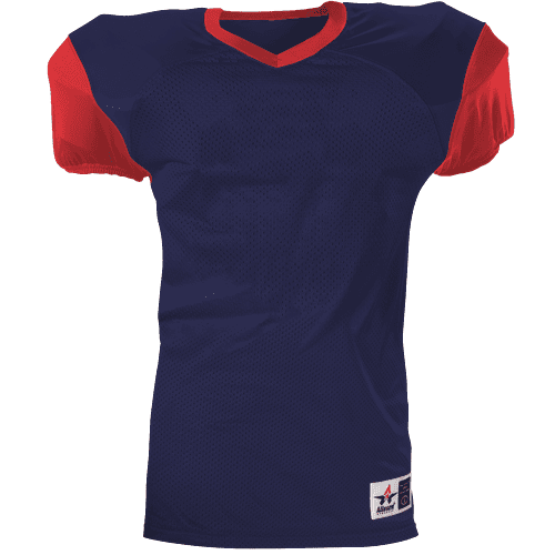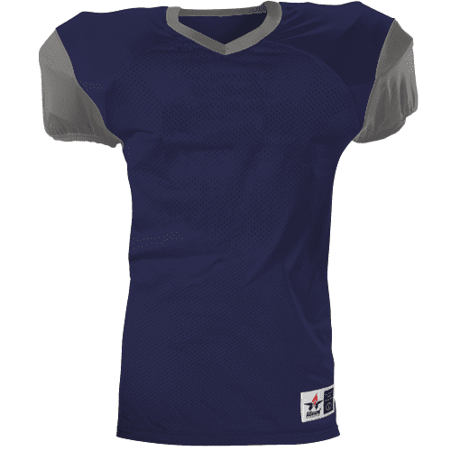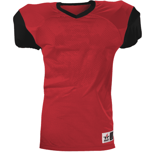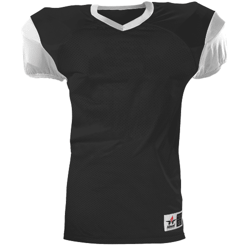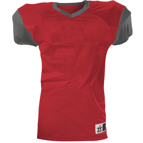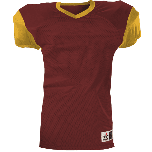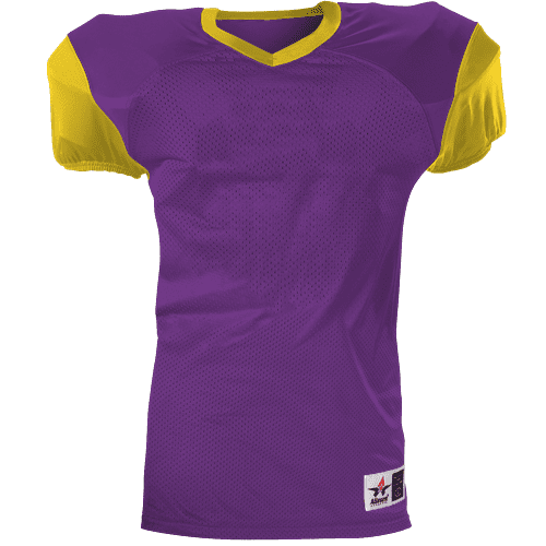Alleson 751Y2 football jersey features 100% extreme mesh cationic colorfast polyester tricot mesh body, double dazzle yoke / sleeves, spandex side inserts for a pro-style fit and a 2-color design. Alleson 751Y2 jersey also features a classic v-neck cut and a full length body cut.