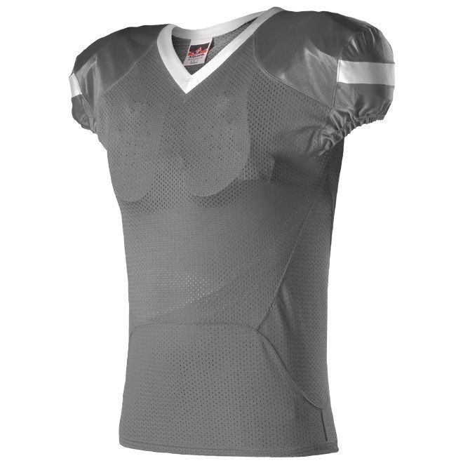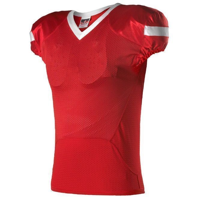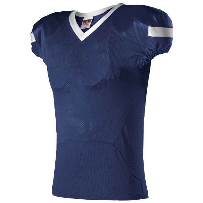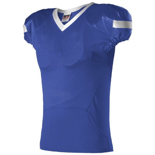 Alleson 754 football jersey features 100% extreme mesh cationic colorfast polyester body and 15% elastane 4-Way Stretch mesh inserts for a fitted pro-style fit. Alleson 754 jersey also features an Extreme Dazzle fabric on yoke and sleeves, contrast sleeve stripes / neck, elastic ribbed sleeve ends, and a full length body cut.