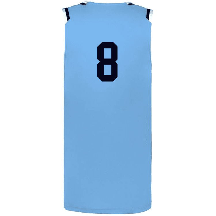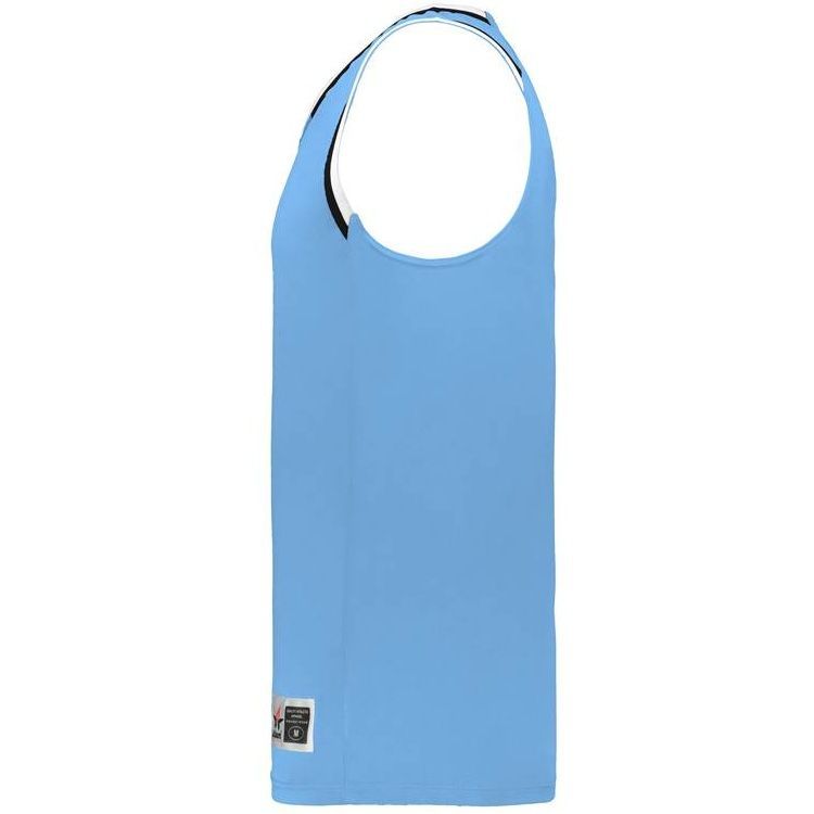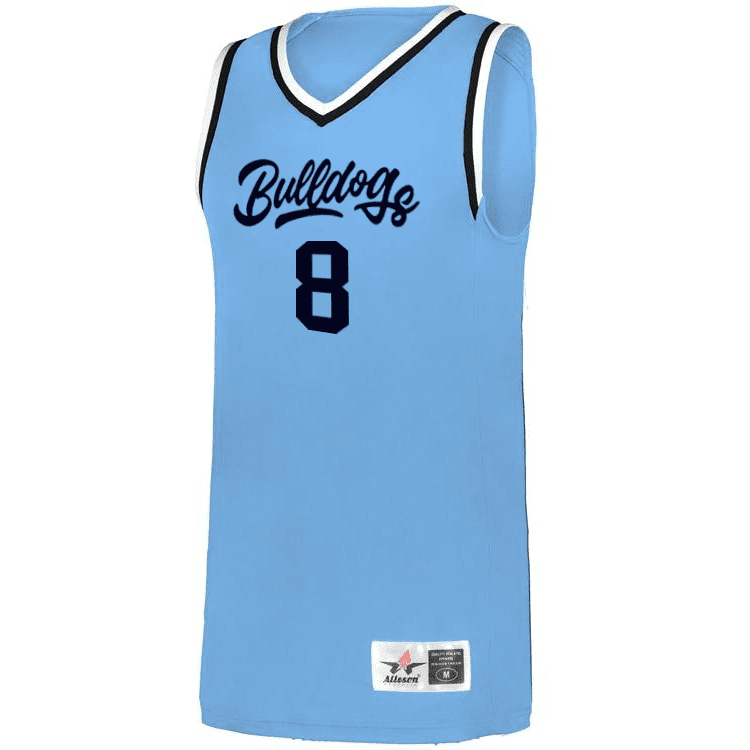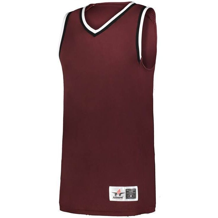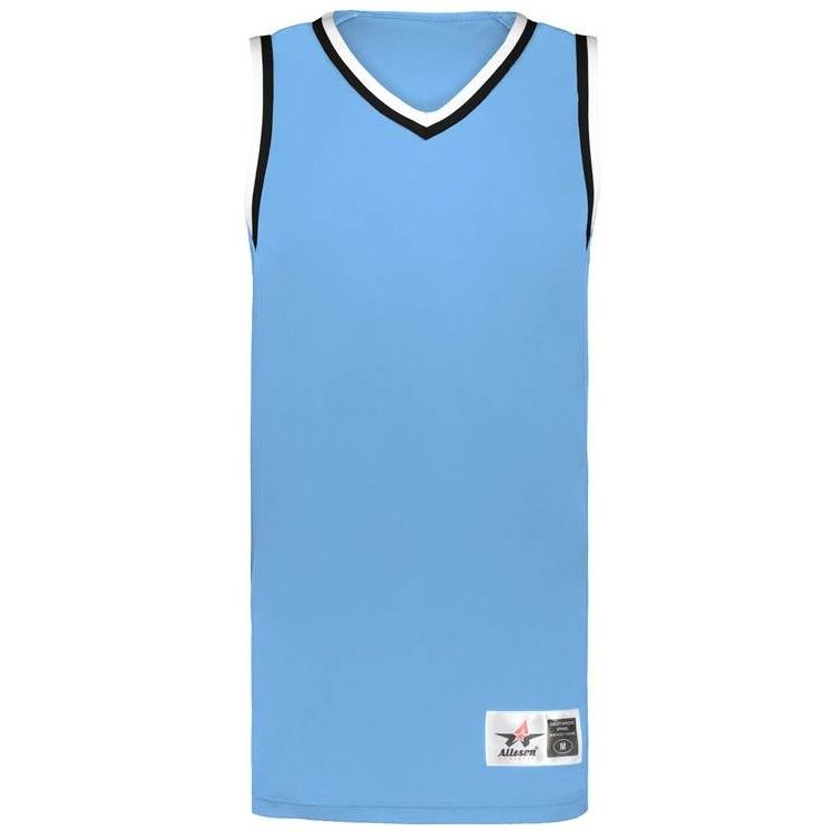 Alleson A5100 basketball jersey features 100% polyester pique wicking fabric and sewn trim. Alleson A5100 basketball jersey also features a v-neck collar, vintage contrast color trim, collegiate cut, jock tag and double needle hemmed bottom.