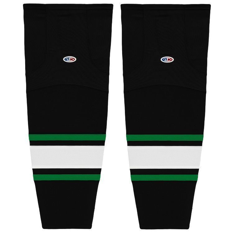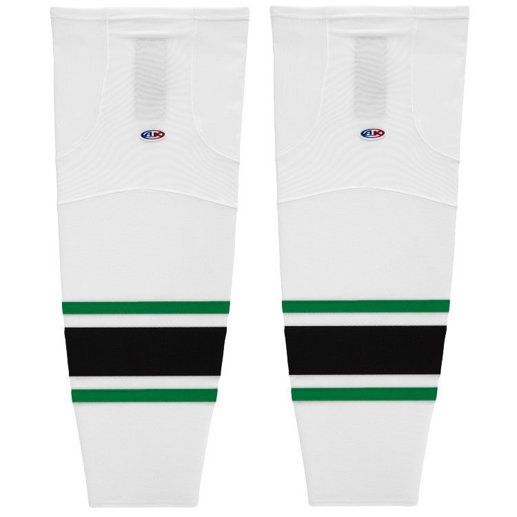 North Dakota old air knit hockey socks in home and away styles. North Dakota old air-knit hockey socks in stock in adult, intermediate and youth sizes in authentic Sioux green, black and white sewn striping. Athletic Knit HS2100 air-knit hockey socks feature pro weight edge style air knit fabric with Dry-Flex wicking stretch panels and two sewn Velcro tabs.