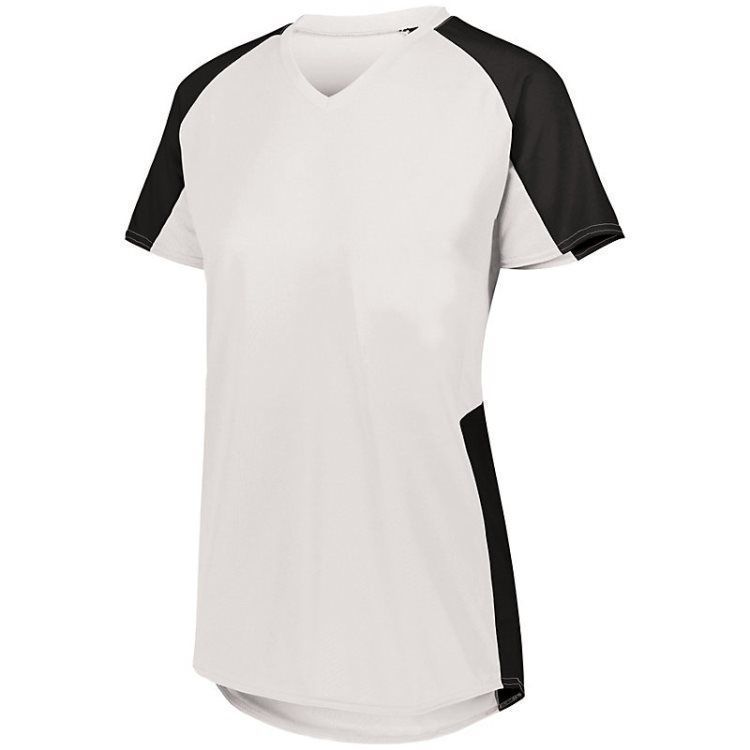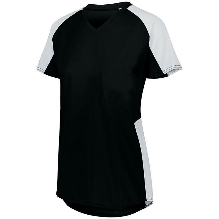 Augusta 1522 Cutter soccer jersey features polyester wicking knit fabric that wicks moisture away from the body, poly-spandex pin hole mesh underarms, contrast color inserts, v-neck design, and double needle hemmed sleeves / bottom. Girls through womens 2XL sizes.