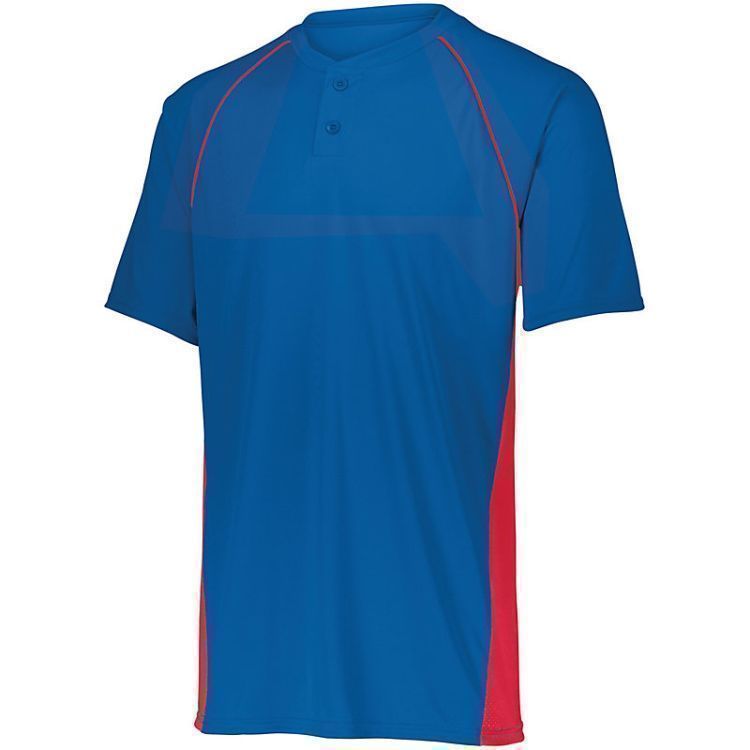 Augusta 1560 Limit 2 button baseball jersey with mid weight wicking knit body and 8% spandex pin-hole mesh fabric on sides. Augusta 1560 1561 baseball jersey has a two button front, contrast color shoulder piping and side stripes, set-in sleeves and double stitched bottom hem. Youth through adult 3XL sizes.