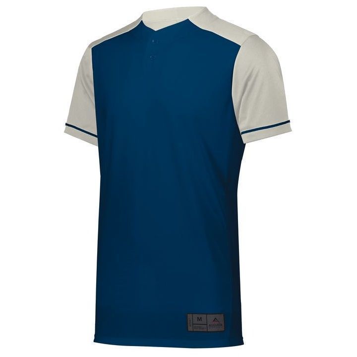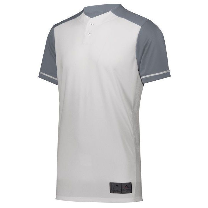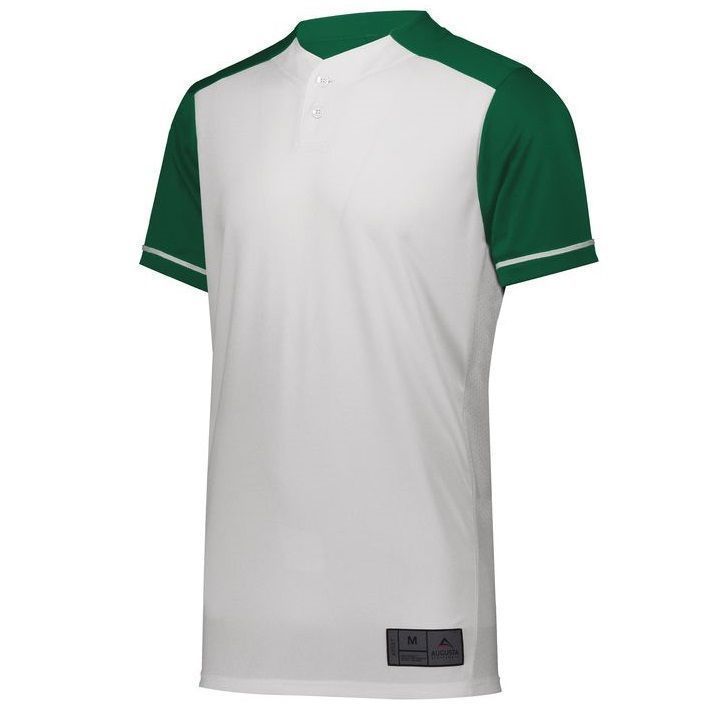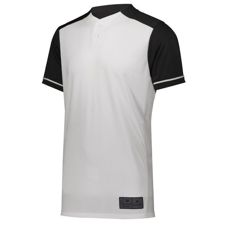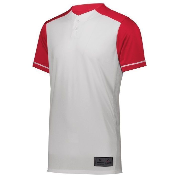 Augusta 1568 Closer 2 button baseball jersey with mid weight wicking knit body and 8% spandex pin-hole mesh fabric on sides. Augusta 1568 1569 baseball jersey has a two button front, contrast color sleeves, sleeve piping, set-in sleeves and double stitched bottom hem. Youth through adult 3XL sizes.