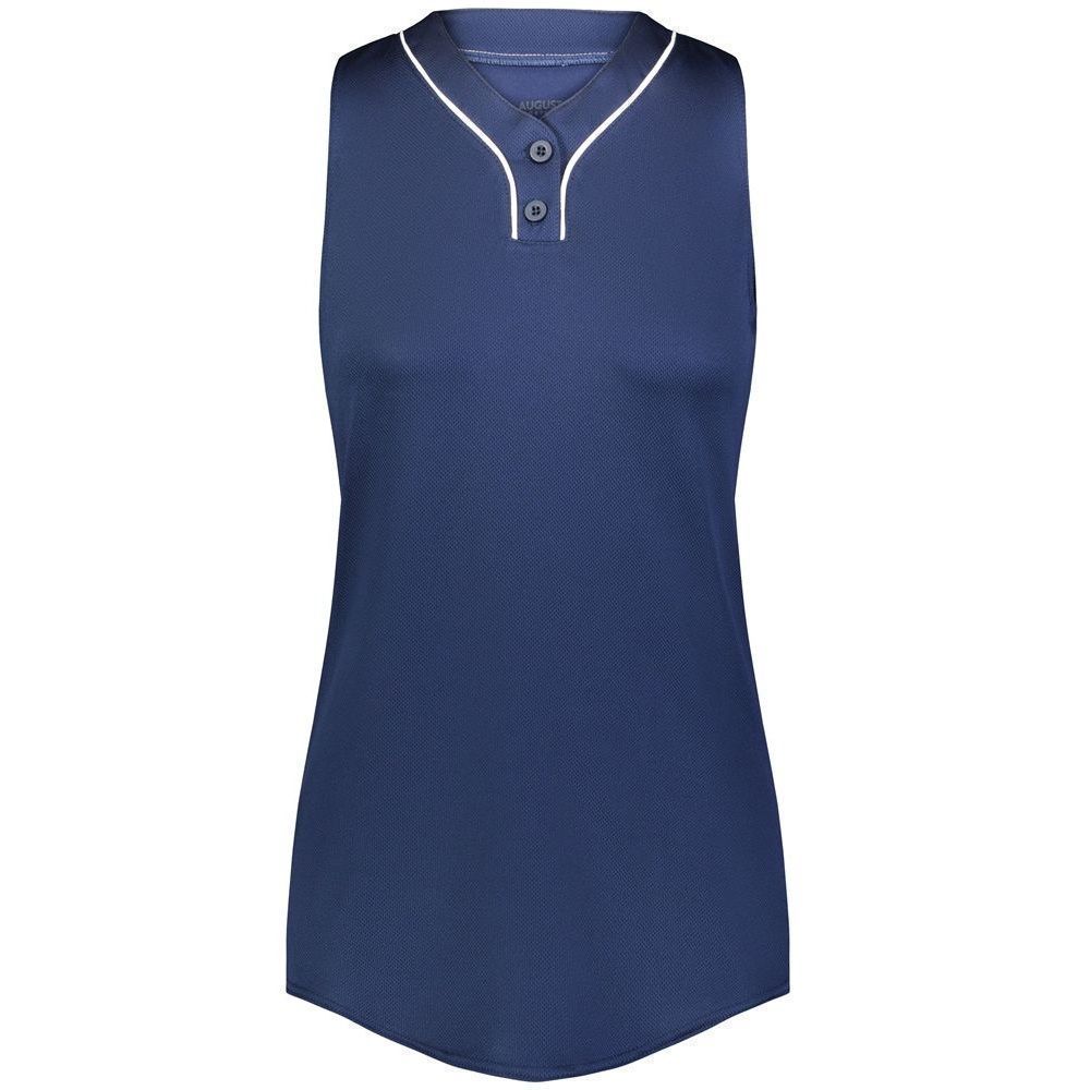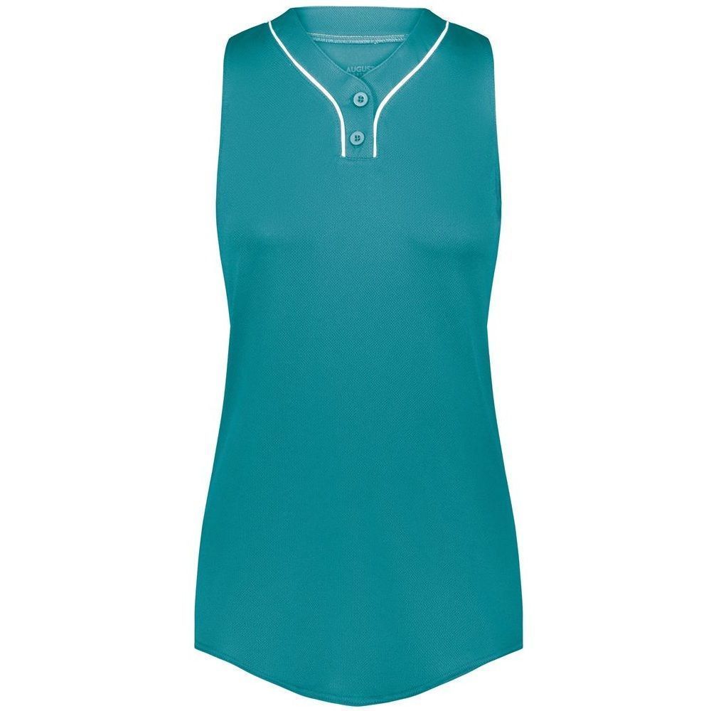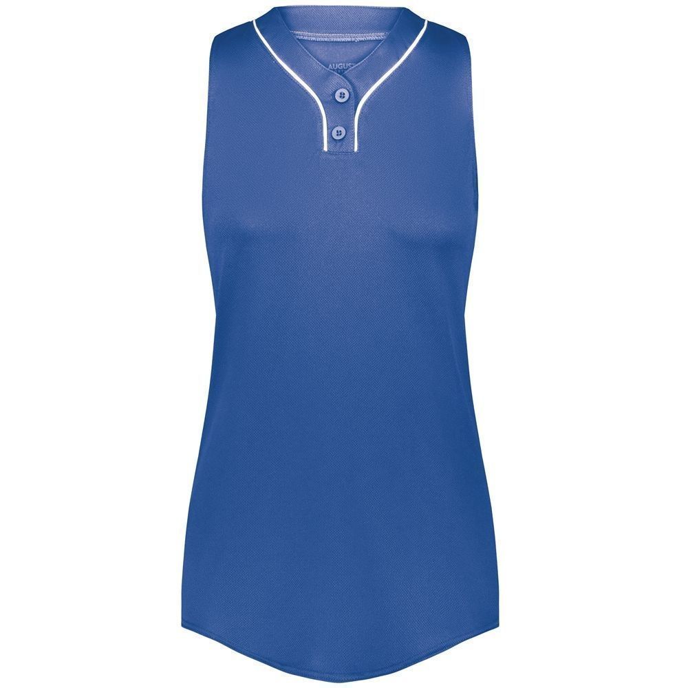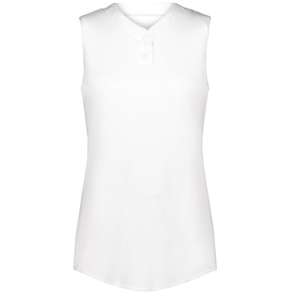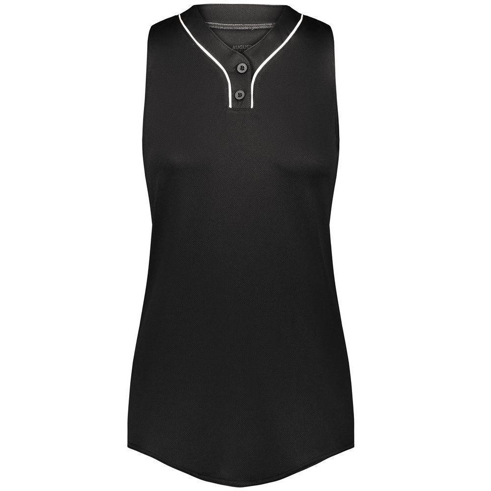 Augusta 6913 Cutter 2 button sleeveless softball jersey with poly spandex fabric with 4-way stretch. Augusta 6913 6914 softball jersey has a two button front, 50+ UPF sun protection, contrast neck / placket trim and double stitched curved bottom hem. Girls through womens 2XL sizes.