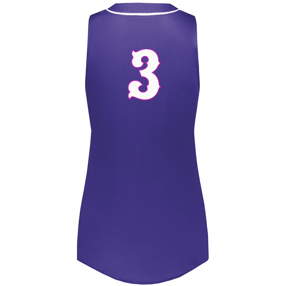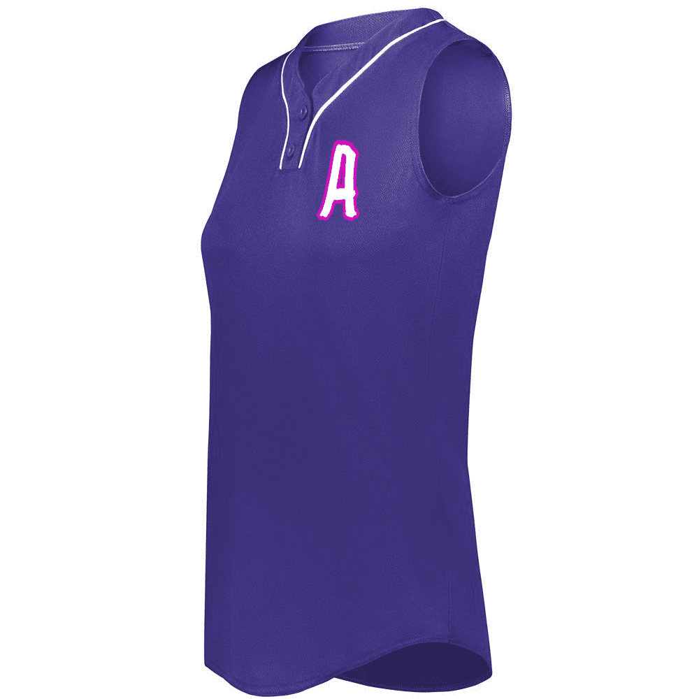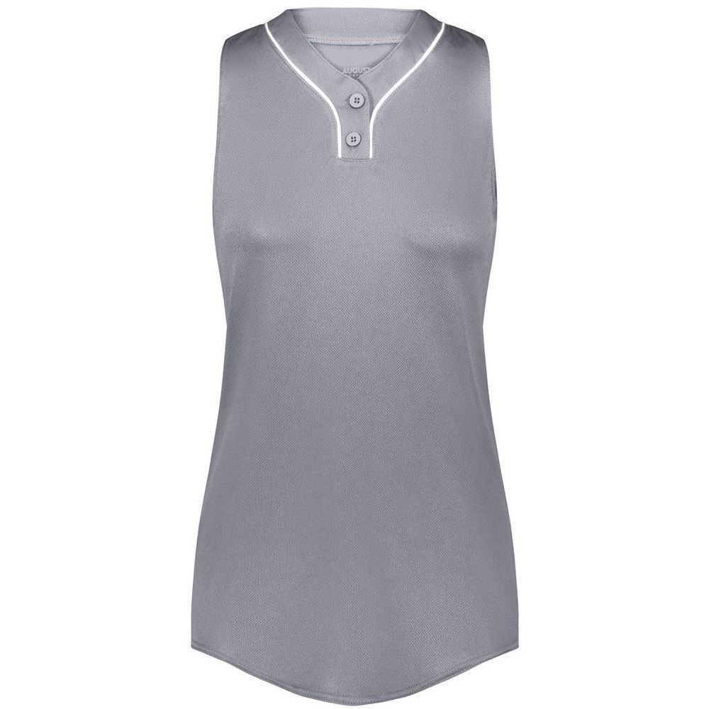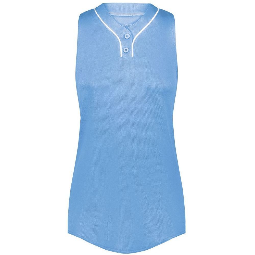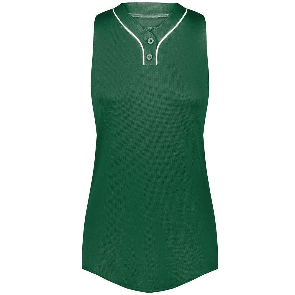 Augusta 6913 Cutter 2 button sleeveless softball jersey with poly spandex fabric with 4-way stretch. Augusta 6913 6914 softball jersey has a two button front, 50+ UPF sun protection, contrast neck / placket trim and double stitched curved bottom hem. Girls through womens 2XL sizes.