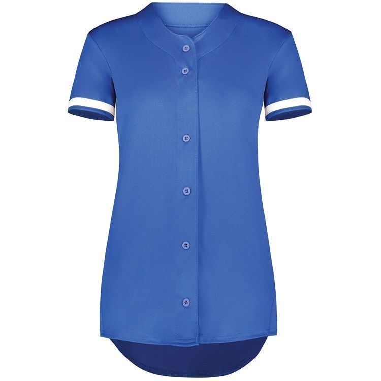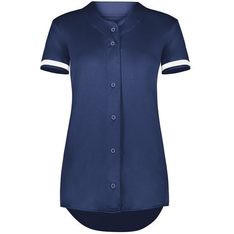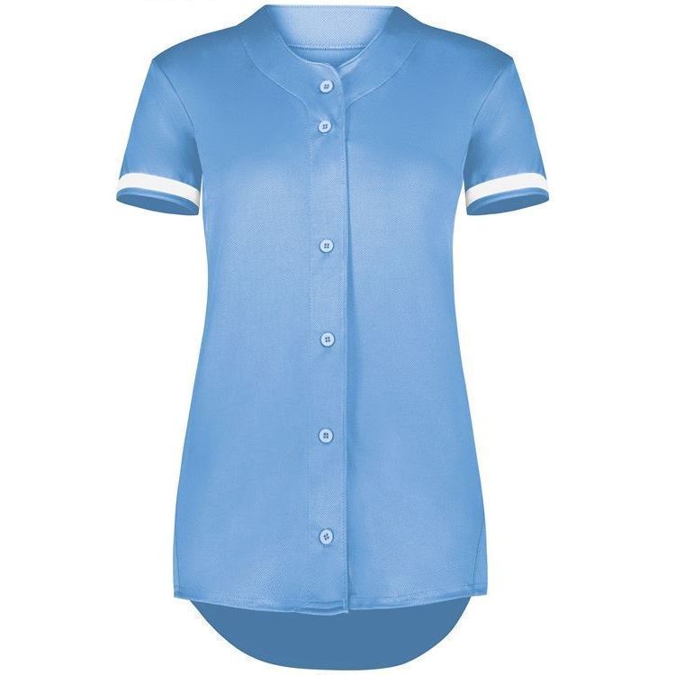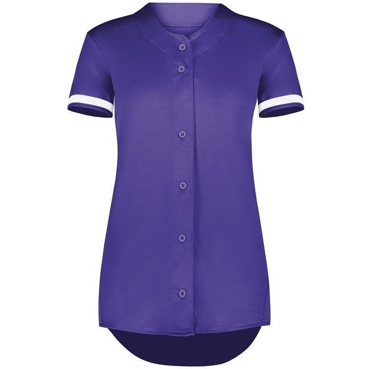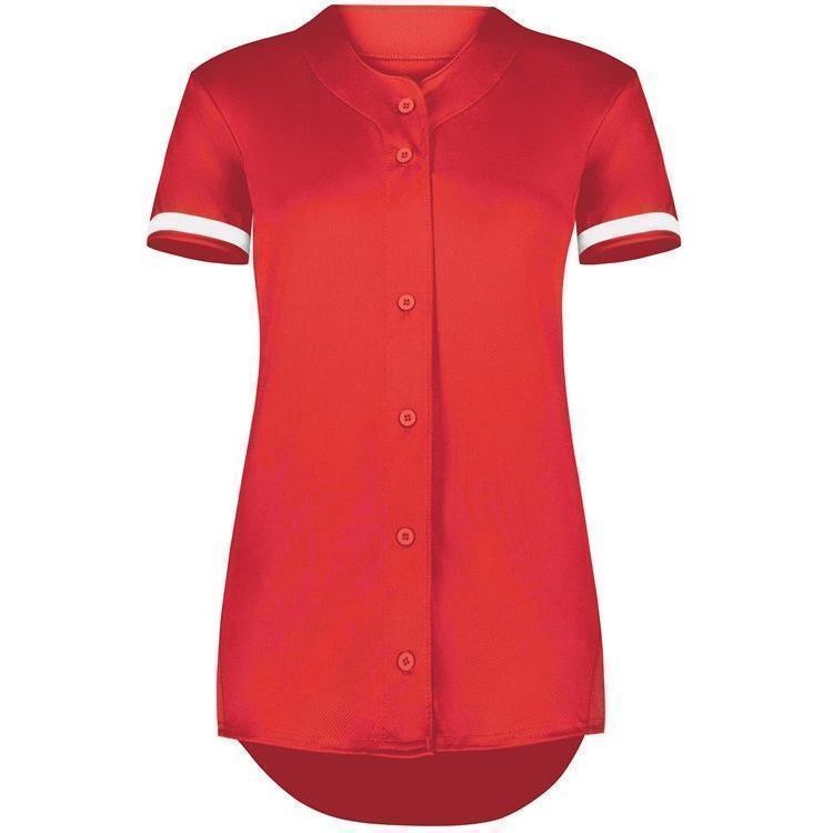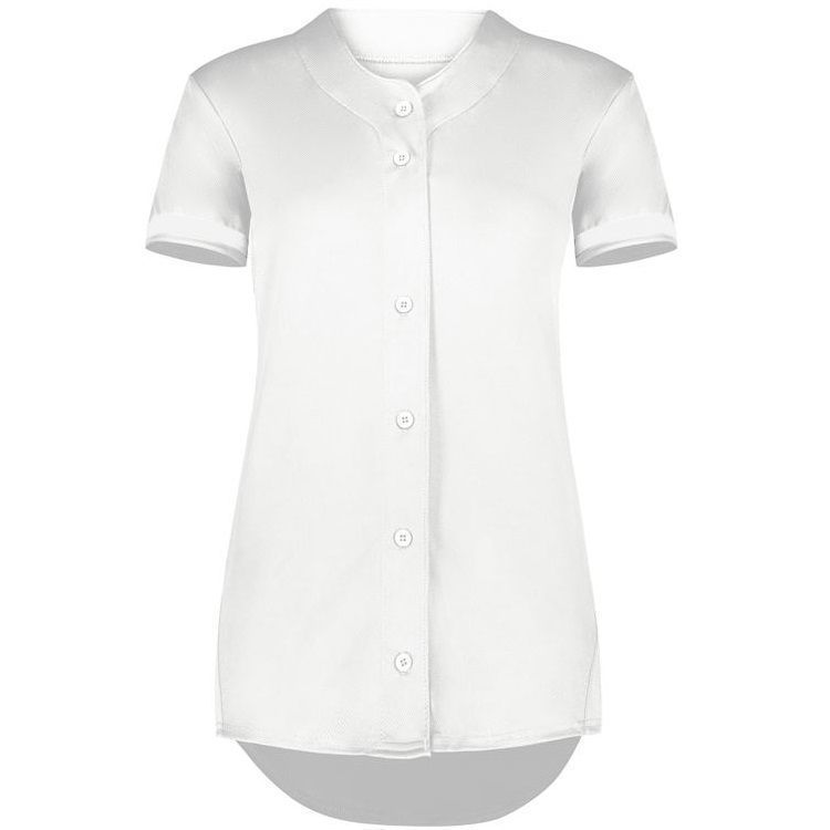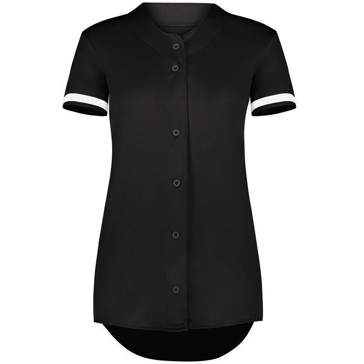 Augusta 6919 Womens Cutter full button softball jersey with poly spandex fabric with 4-way stretch. Augusta 6919 6929 softball jersey has a full button front, 50+ UPF sun protection, contrast color sleeve stripes and double stitched curved bottom hem. Girls through womens 2XL sizes.