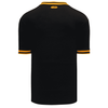 Blank Pittsburgh Pirates BA1333-212 throwback v-neck baseball jersey is made of mid-weight Dry-Flex wicking fabric with vintage 1986 Pirates inspired knitted neck and sleeve trim. Athletic Knit BA1333-212 baseball jersey has a plain black body with black and vintage gold sewn 3-color trim, an athletic cut and double needle hem bottom. These blank throwback jerseys have a retro inspired look combined with a modern wicking fabric for total player comfort.