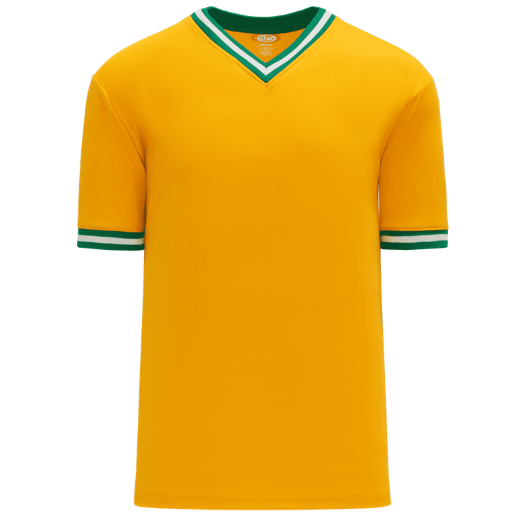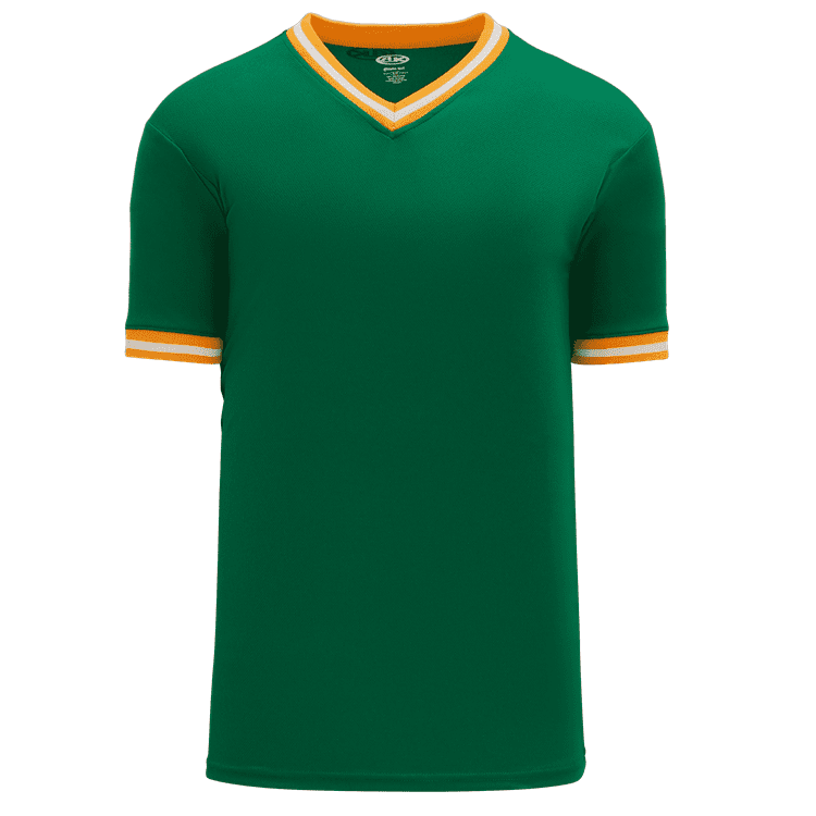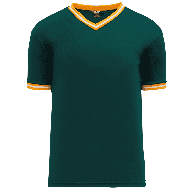 Blank Oakland A's BA1333 throwback v-neck baseball jerseys are made of mid-weight Dry-Flex wicking fabric with vintage 1981 kelly/gold and 1985 dark green/gold knitted neck and sleeve trim. Athletic Knit BA1333 baseball jerseys have a a v-neck, plain body with 3-color sewn vintage trim, an athletic cut and double needle hem bottom. These blank throwback jerseys have a retro inspired look combined with a modern wicking fabric for total player comfort.