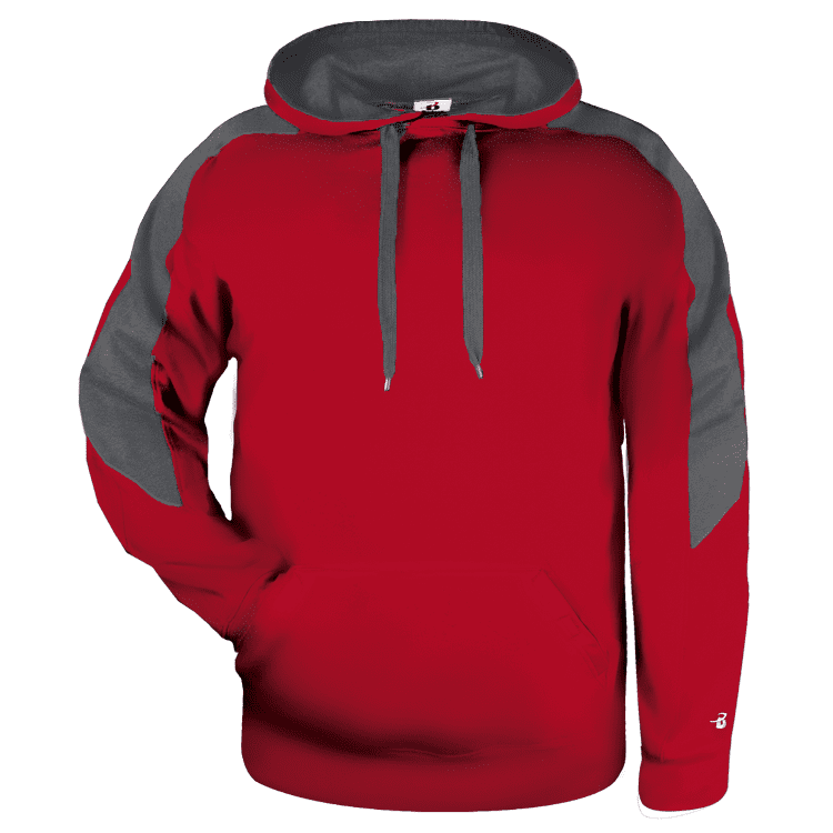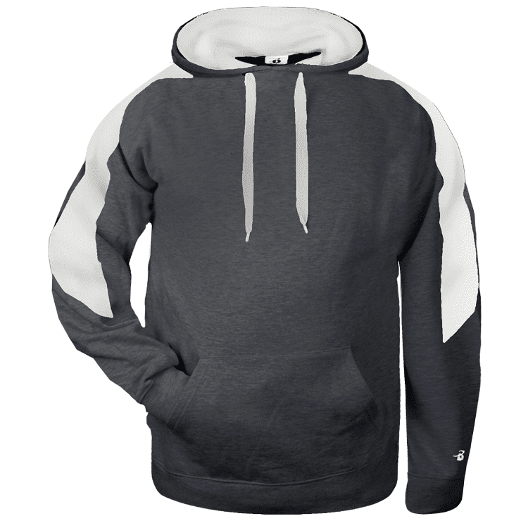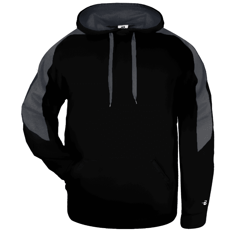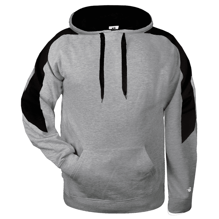 Badger 1265 Sabre Hoodie features 9.5oz 60% polyester / 40% cotton fleece for maximum comfort. Badger Sabre pullover hooded sweatshirt features contrast color shoulder/sleeve inserts, 2-ply contrast color lined hood with flat drawcord, spandex rib knit cuffs, and kangaroo front pouch pocket with headset opening.