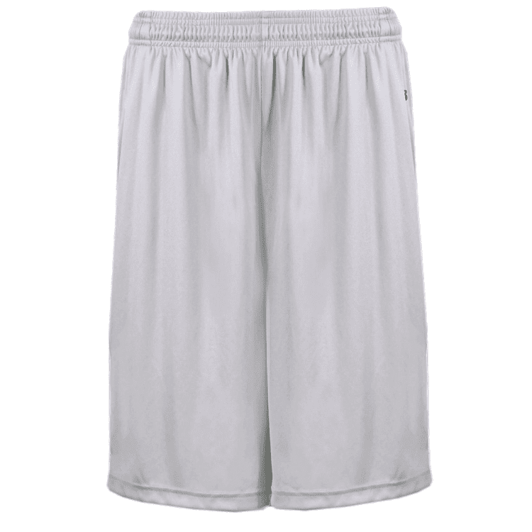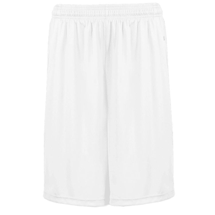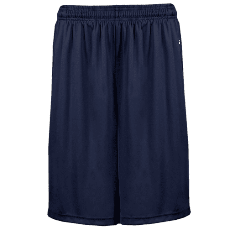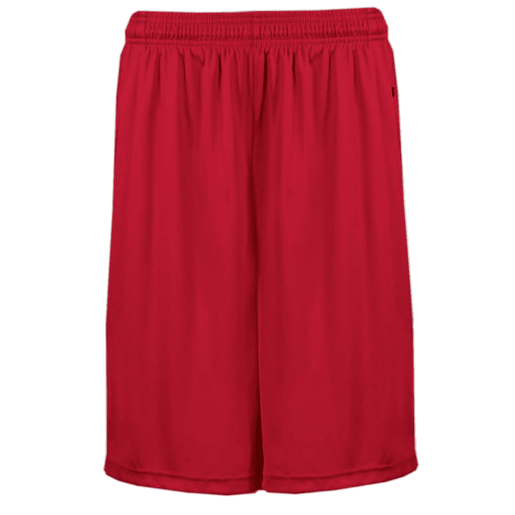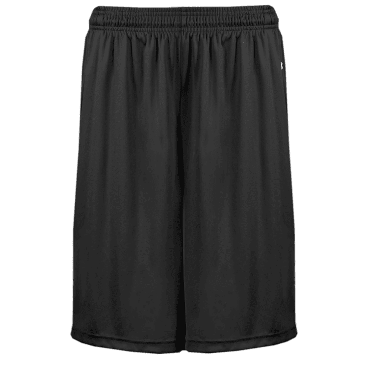 Badger 4127 B-Core athletic shorts with side seam pockets. Badger 4127 shorts feature wicking fabric with covered elastic waistband with inside draw cord, full athletic cut and solid color design. Youth have 7 inch inseam while adult version has choice of 7 or 9 inch inseam.