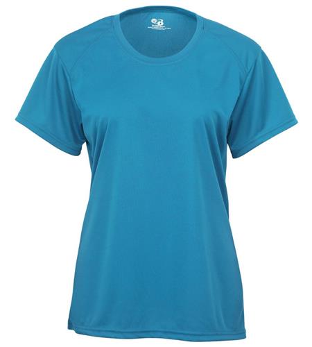Badger B-Core Moisture Wicking Womens T Shirt features a 100% polyester antimicrobial / moisture wicking fabric that pulls sweat away from the skin for easy evaporation. Badger 4160 crew neck wicking tee has a womens specific fit, self fabric collar and double needle bottom hem. Tagless heat-seal label.