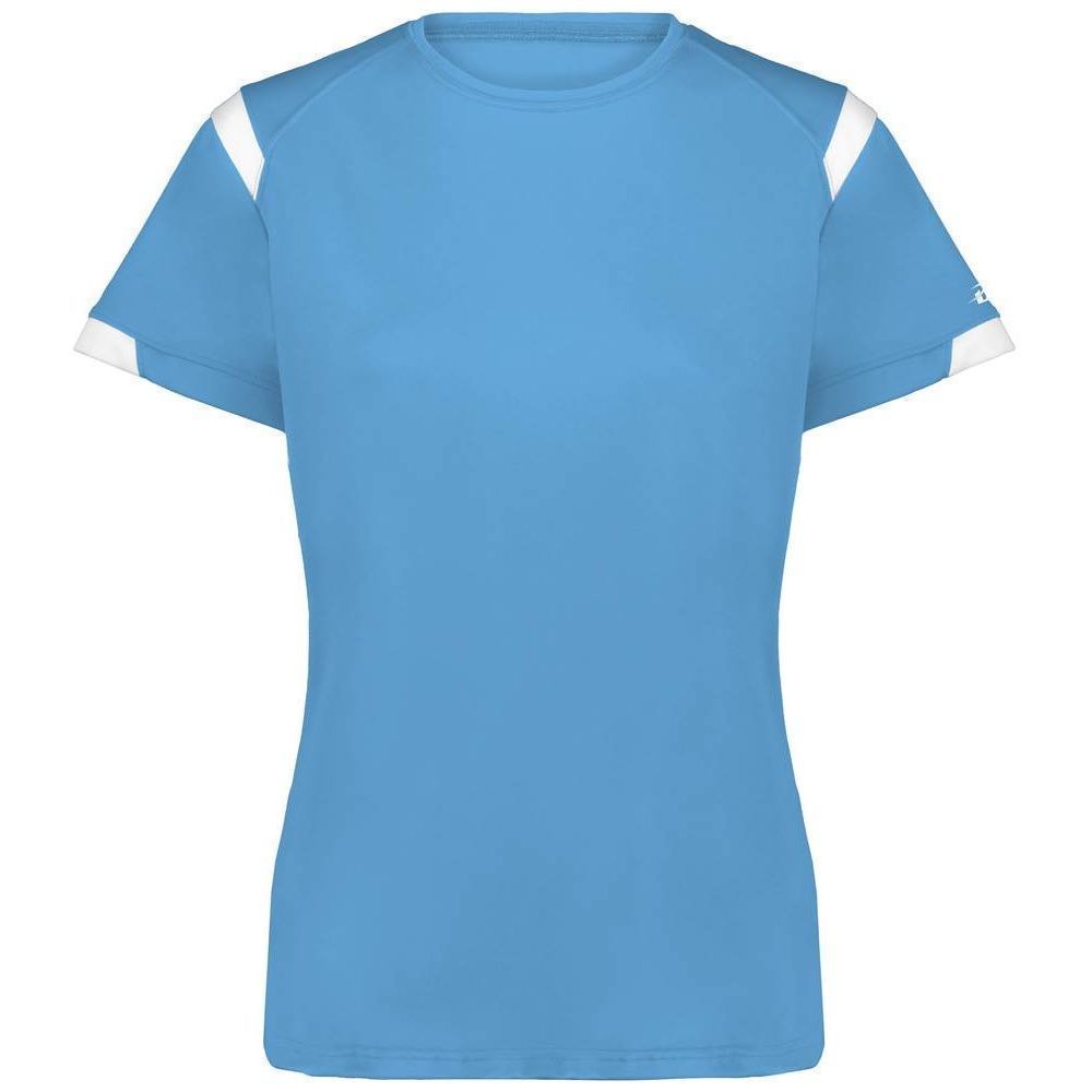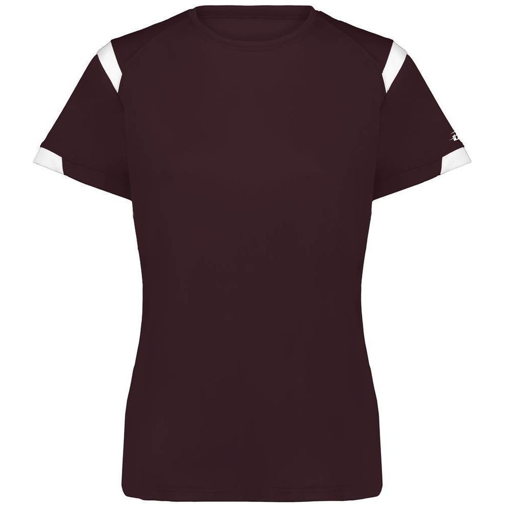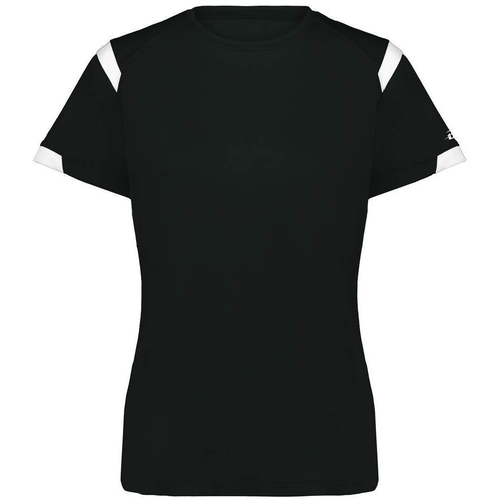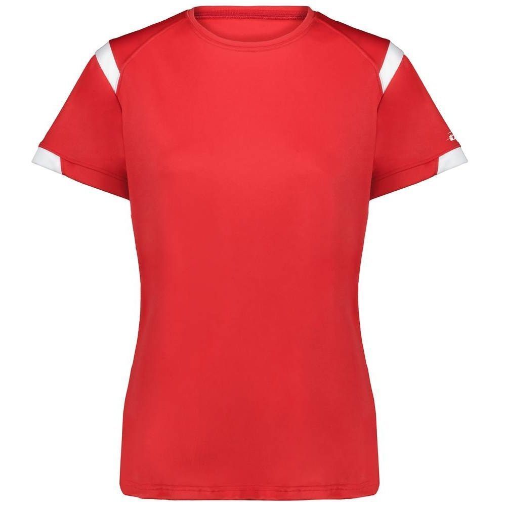 Badger 4380 Rise womens crew jersey features a 100% polyester antimicrobial / moisture wicking interlock fabric that pulls sweat away from the skin for easy evaporation. Badger 4380 womens jersey crew has contrast color shoulder / sleeve inserts, self fabric crew collar and double needle bottom hem. Tagless heat-seal label.