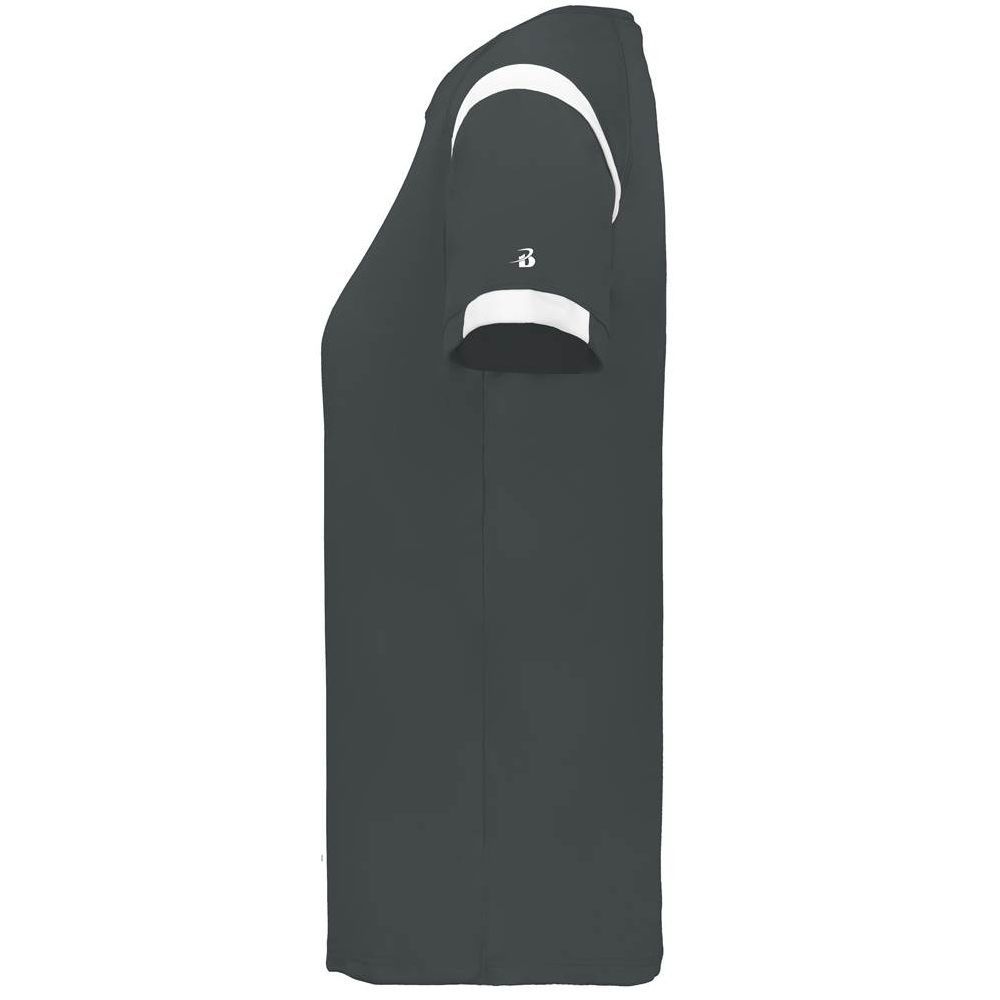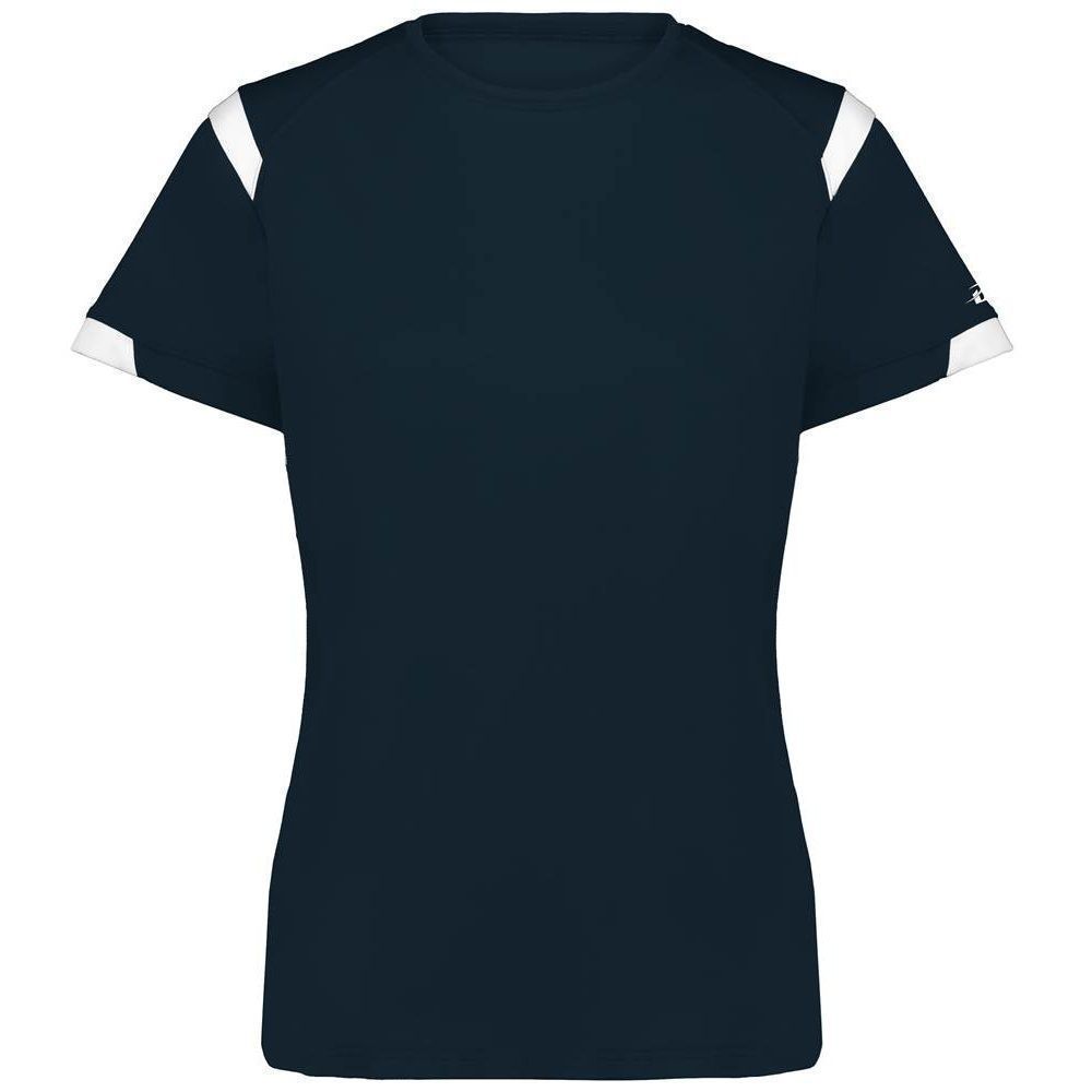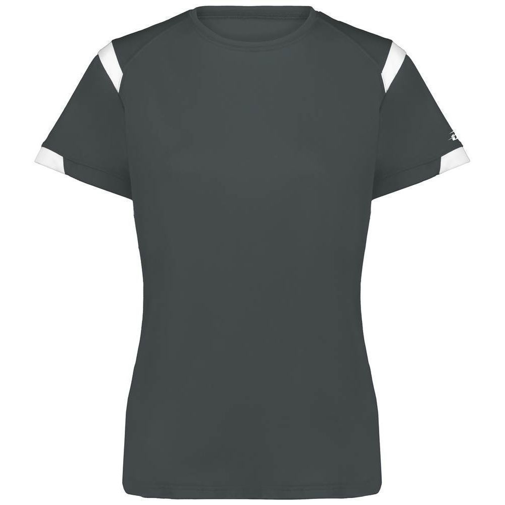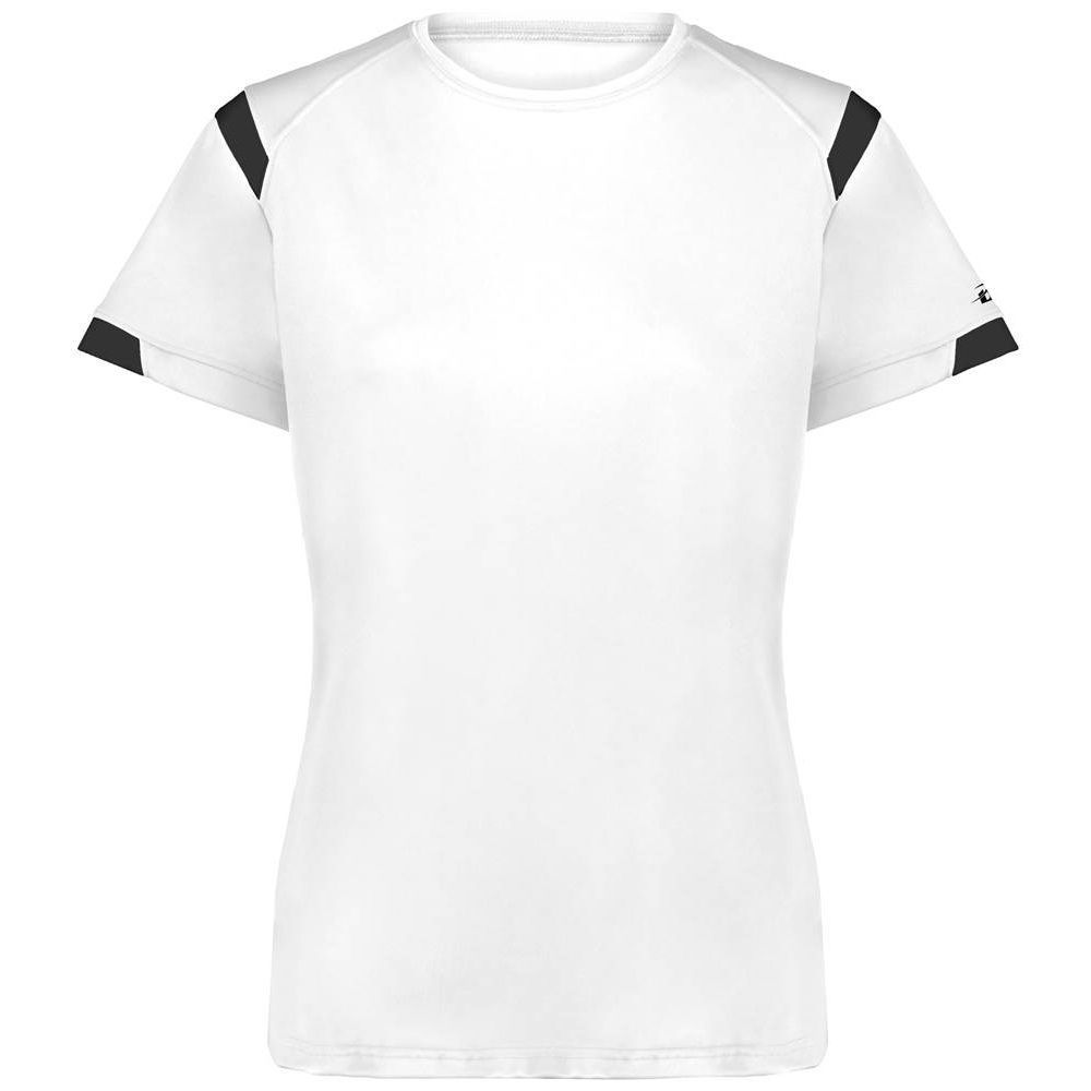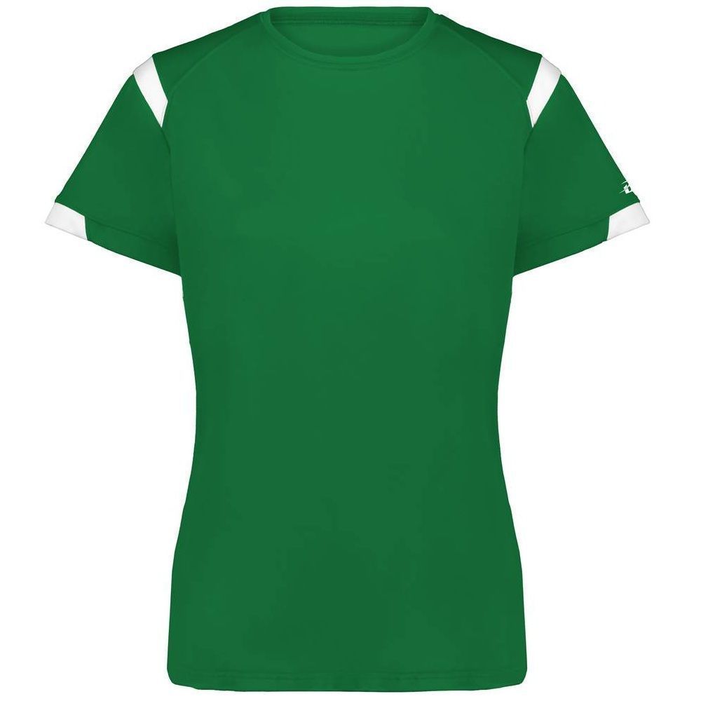 Badger 4380 Rise womens crew jersey features a 100% polyester antimicrobial / moisture wicking interlock fabric that pulls sweat away from the skin for easy evaporation. Badger 4380 womens jersey crew has contrast color shoulder / sleeve inserts, self fabric crew collar and double needle bottom hem. Tagless heat-seal label.