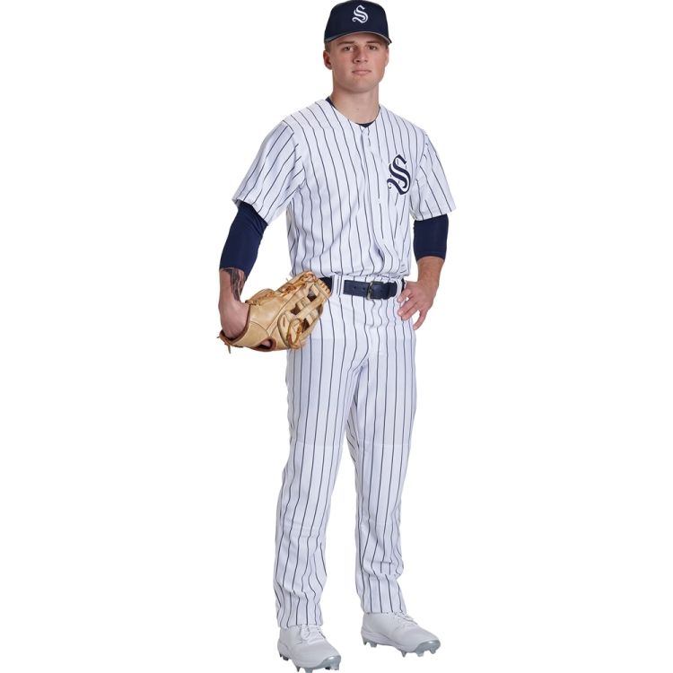 Champro BP60PIN pinstripe baseball pants are made of 14oz. 4-way stretch Tek-knit fabric and semi fitted design. Champro pinstripe baseball pants have open bottom hems, 2-1/2 inch wide waistband with gripper waist, Velcro adjustable inseam, 7 pro style belts loops, double reinforced knees, dual snap closure with zipper fly, two inset back pockets and a straight leg relaxed fit.