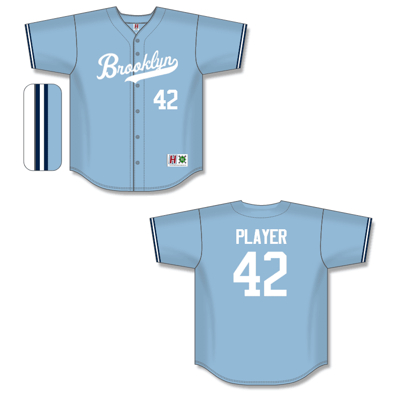 Broolyn Dodgers HG400-BRK custom full button baseball jerseys for adult and youth teams. Homegrown HG400-BRK retro Dodgers pattern features a solid baby blue body in Dura Light Pro wicking fabric body with throwback royal and white sewn braiding on the sleeve and neck openings.